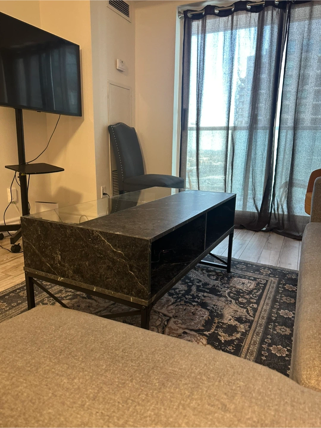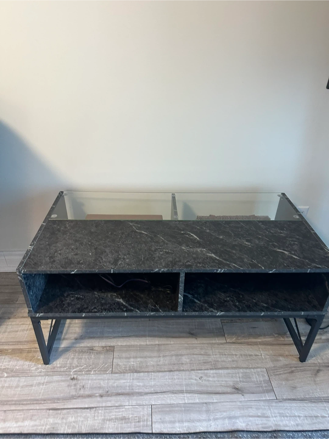 This coffee table has a faux marble finish with a clear glass top. It features four open storage shelves and a black metal frame. It's perfect for a living room or den.