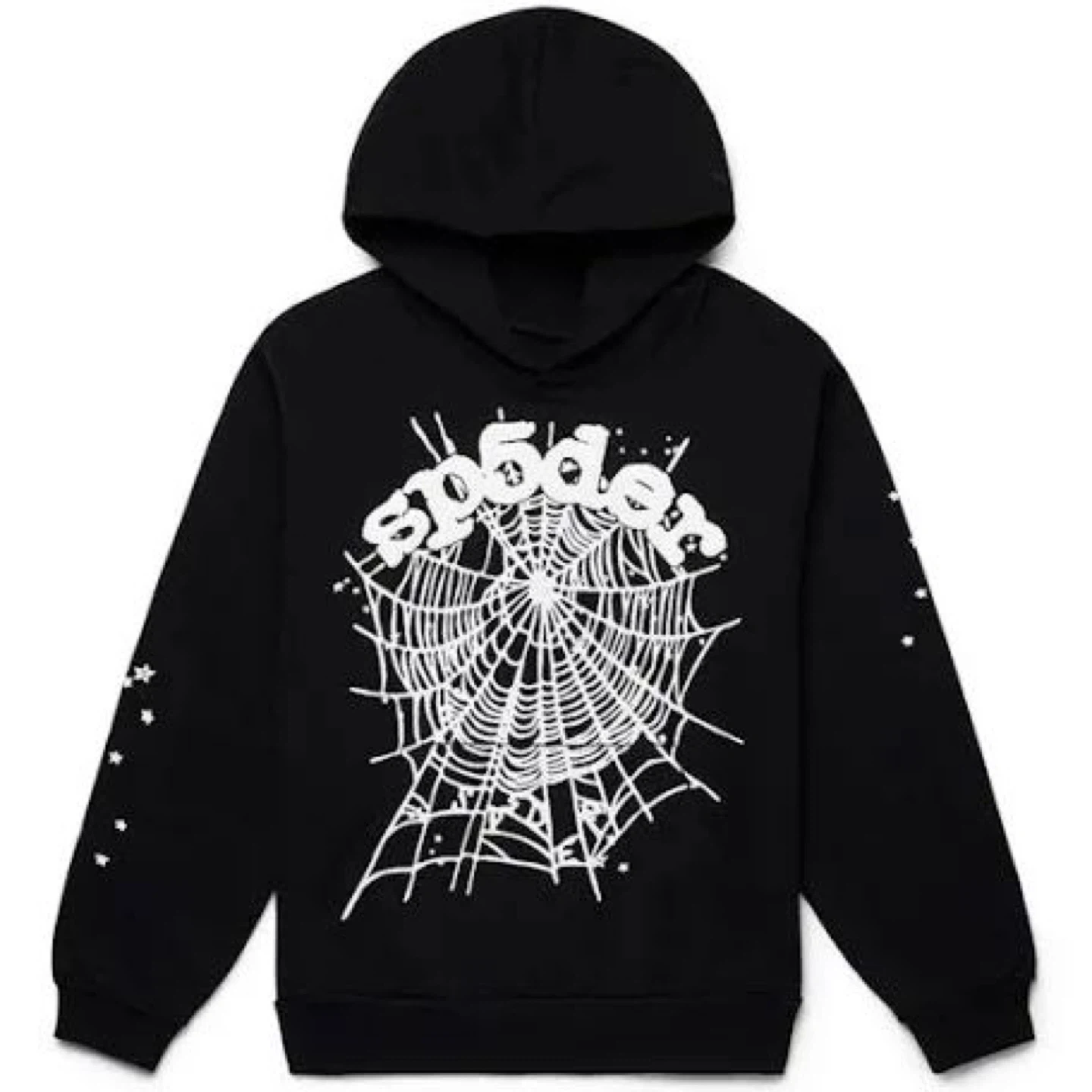 Black hoodie with a spiderweb graphic. Features "sp5der" branding on the front and small star graphics on the sleeves. Pullover style with a hood.