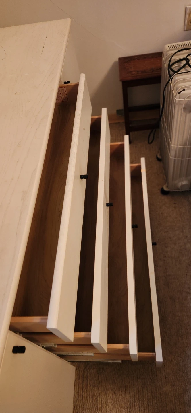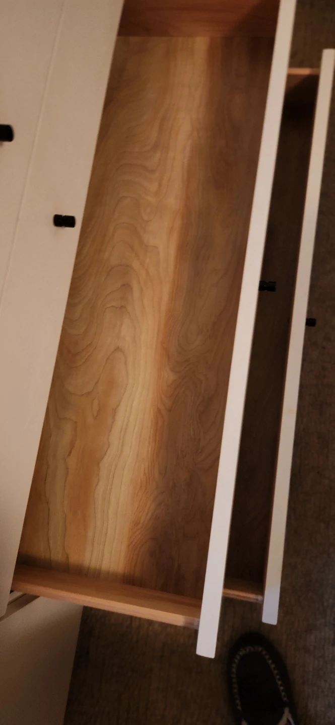 This sideboard features three drawers and two cabinet doors for ample storage. The interior is finished with natural wood. It's a clean and functional piece for any room.