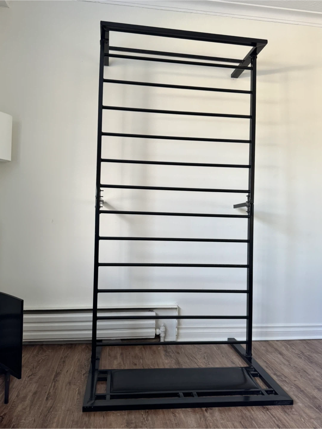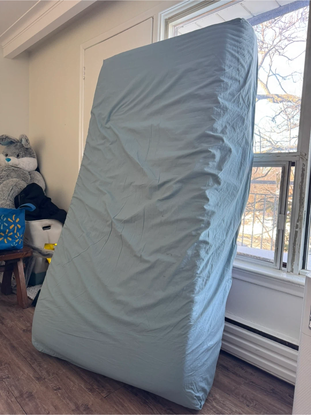 A sturdy black metal bed frame designed for a twin-sized mattress. It features a modern slatted base and a simple upholstered headboard for added comfort. This frame is built to last and easy to assemble. Perfect for a bedroom or guest room!