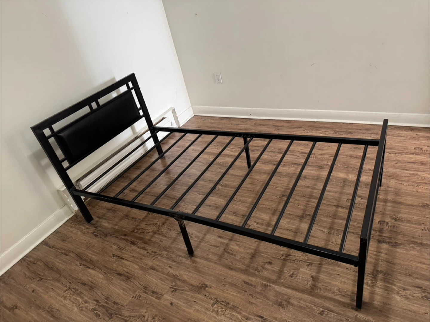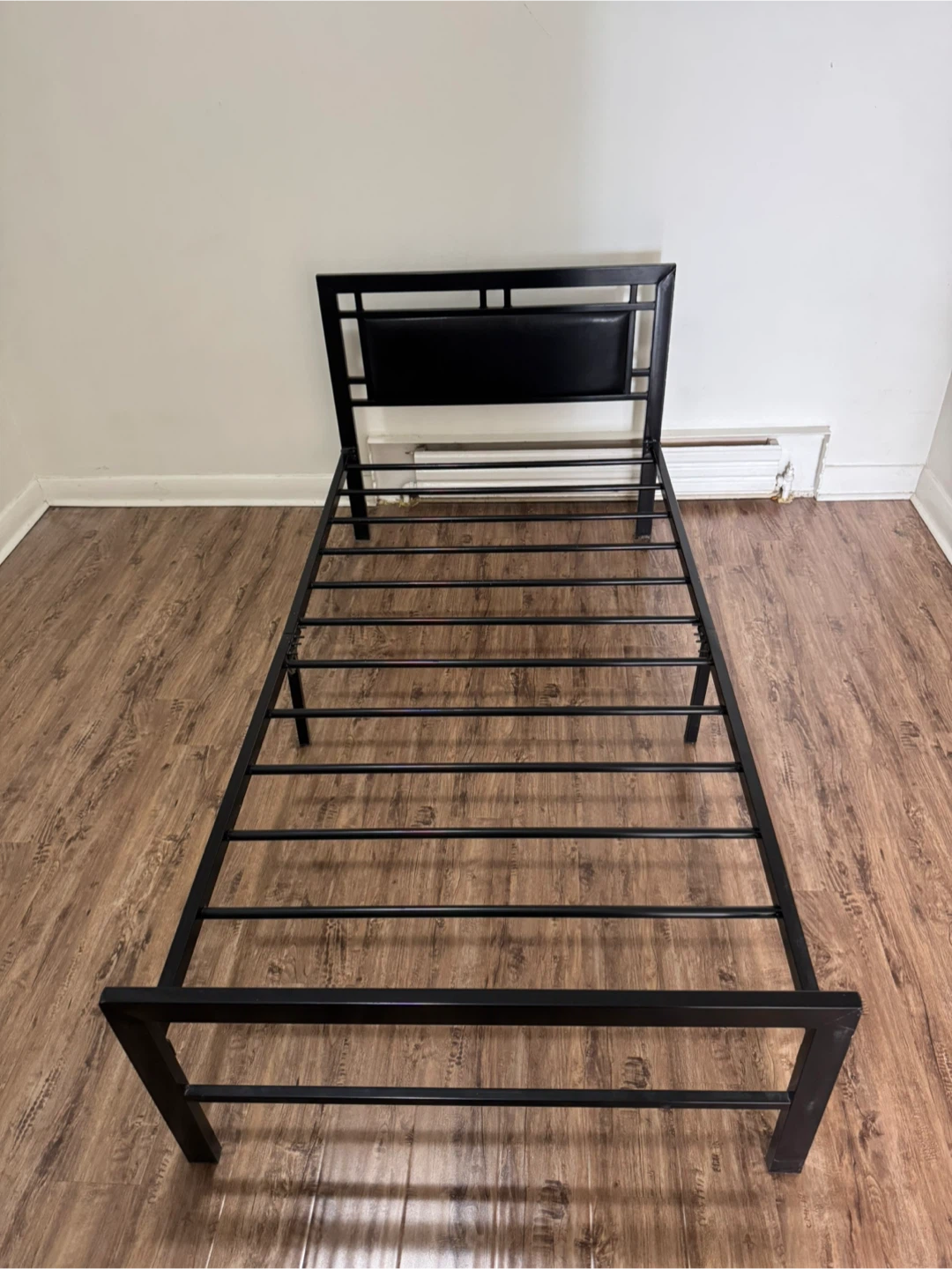 A sturdy black metal bed frame designed for a twin-sized mattress. It features a modern slatted base and a simple upholstered headboard for added comfort. This frame is built to last and easy to assemble. Perfect for a bedroom or guest room!