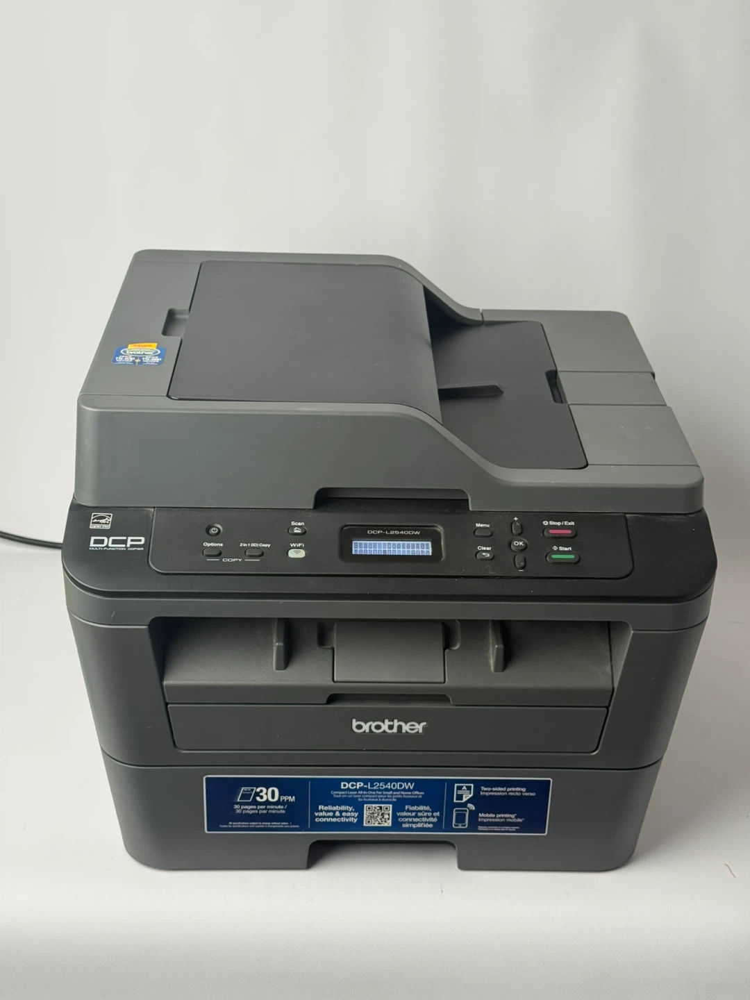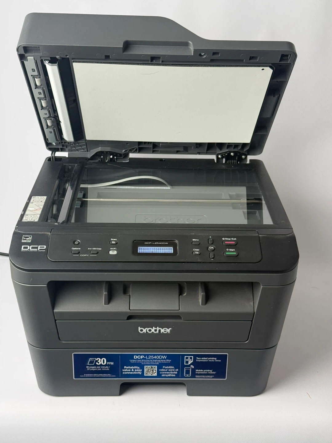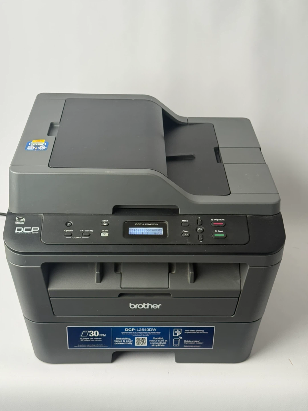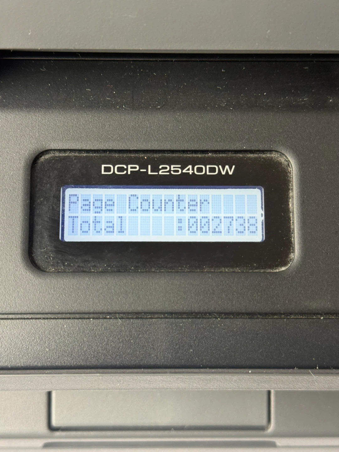This is a Brother DCP-L2540DW wireless monochrome laser printer. It prints up to 30 pages per minute and includes scanning and copying capabilities. The page counter shows a total of 8829 pages printed. It's great for home or small office use where reliable printing is needed. Only 2730 prints. Lots of toner and drum left.