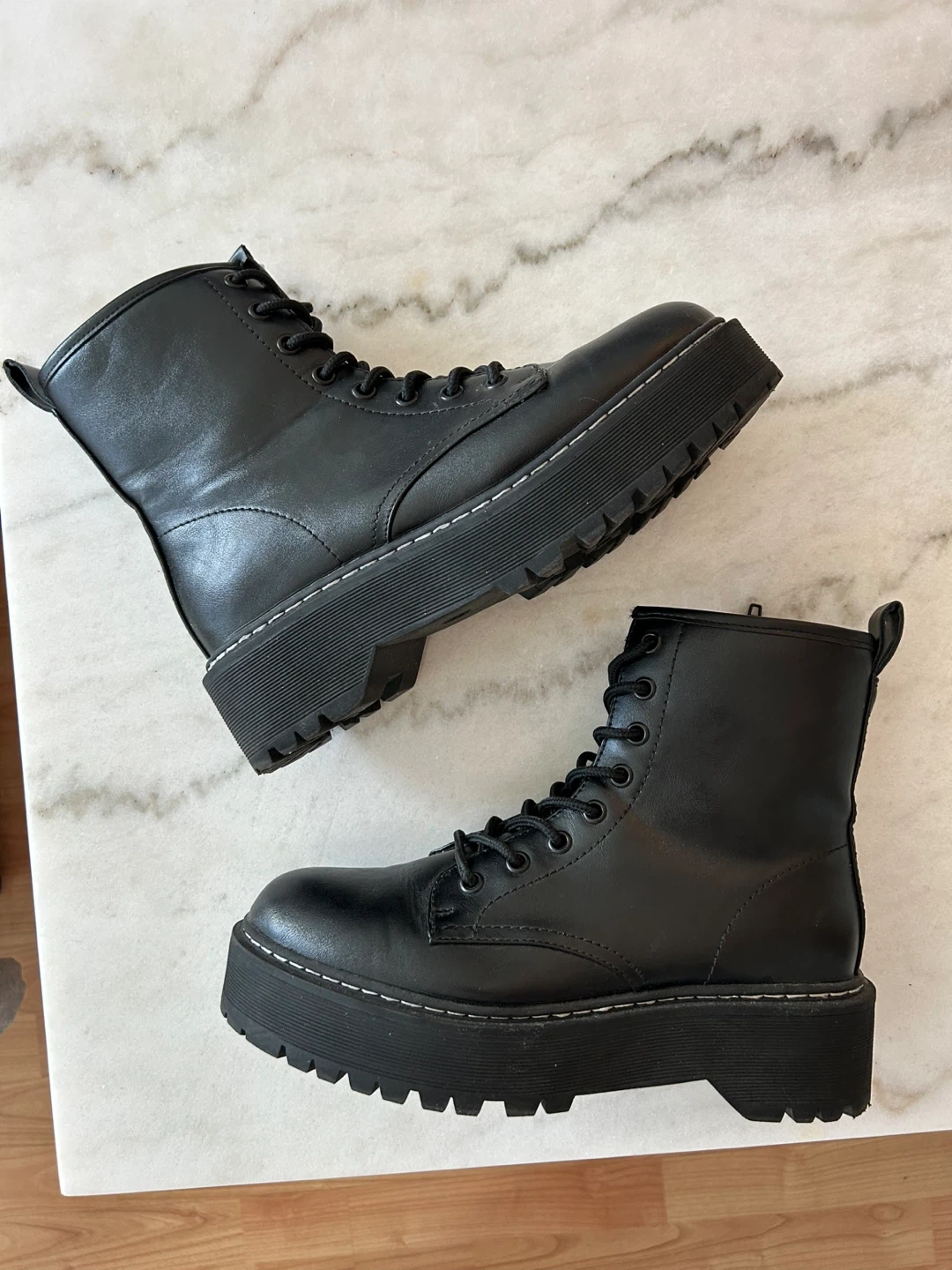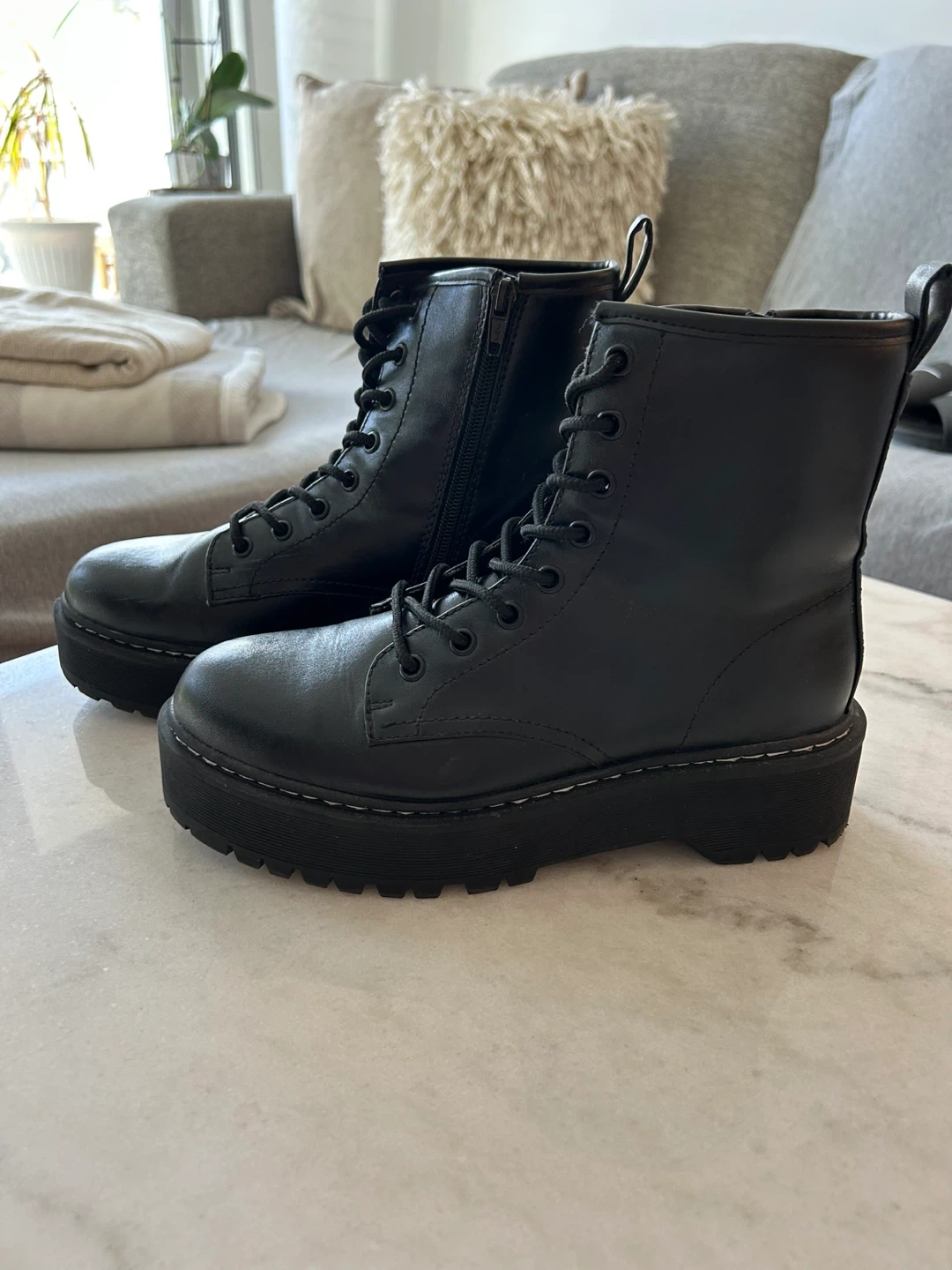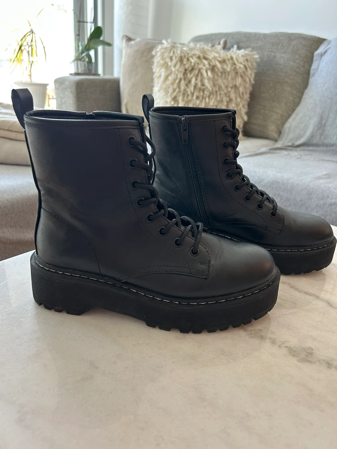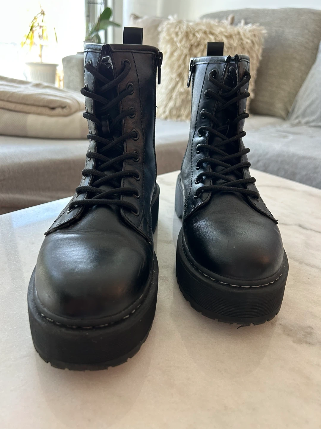 Classic black combat boots with a chunky platform sole. IN GREAT CONDITION (like new, worn once).