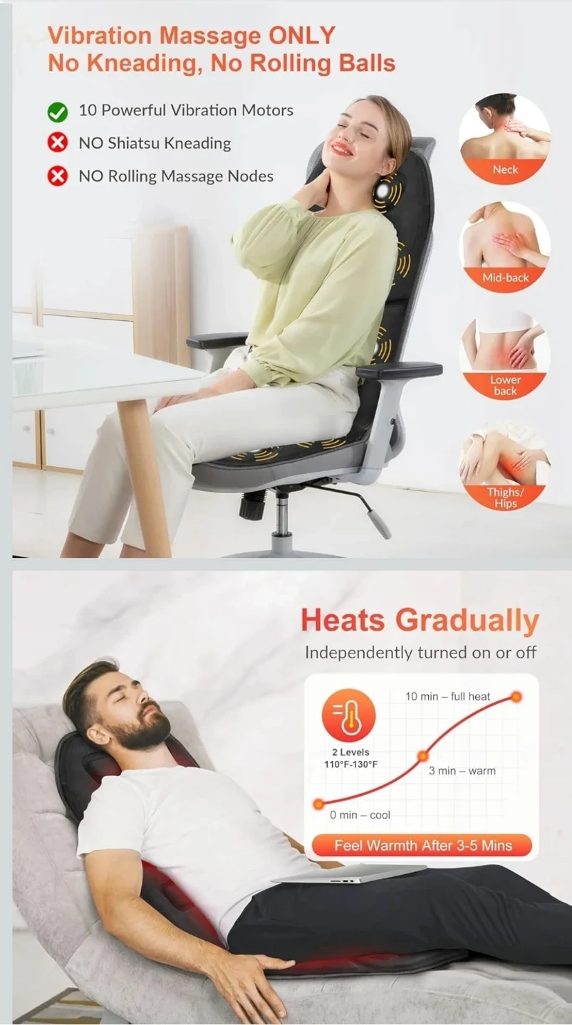 This seat cushion offers vibration massage with 10 powerful motors for neck, mid-back, lower back, and thighs/hips. It heats gradually and independently, reaching 110-150°F with 3 levels. The cushion features a 100% ultra-plush polyester surface and an anti-slip design. It's slim, easy to fold and store, and has a 30-minute auto shut-off timer for safety. This is great for relaxing at home or in the office.