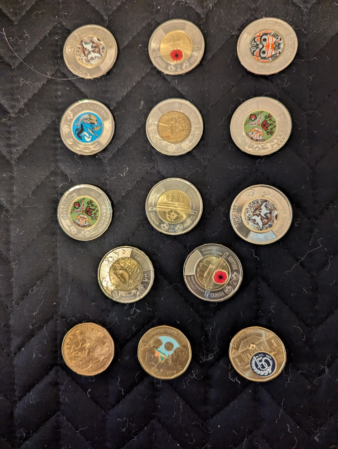 A collection of Canadian toonies and loonies.