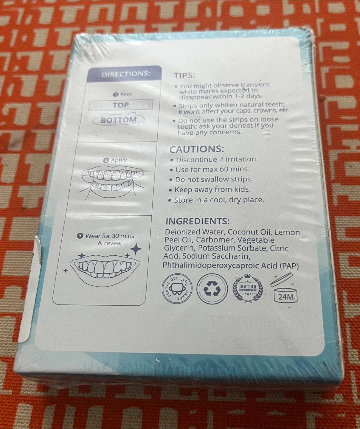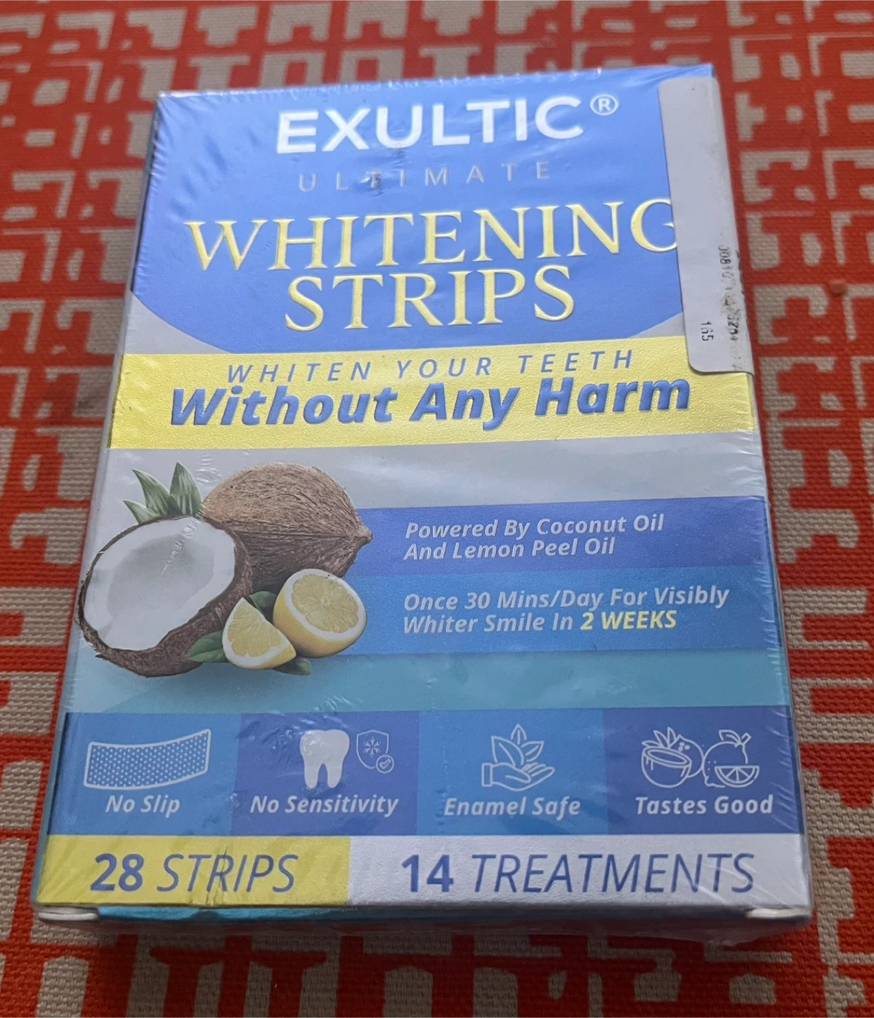 EXULTIC Ultimate Whitening Strips are designed to whiten teeth without harm. They're powered by coconut oil and lemon peel oil. Ingredients include deionized water, coconut oil, lemon peel oil, carbomer, vegetable glycerin, potassium sorbate, citric acid, and sodium saccharin. This package contains 28 strips for 14 treatments.