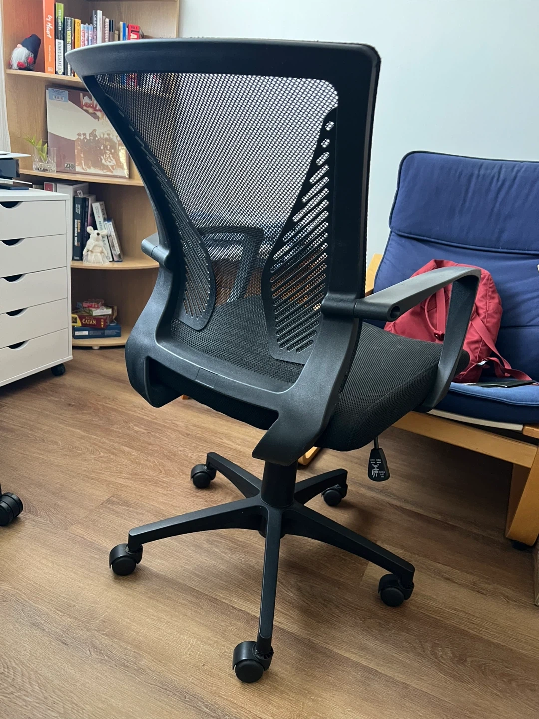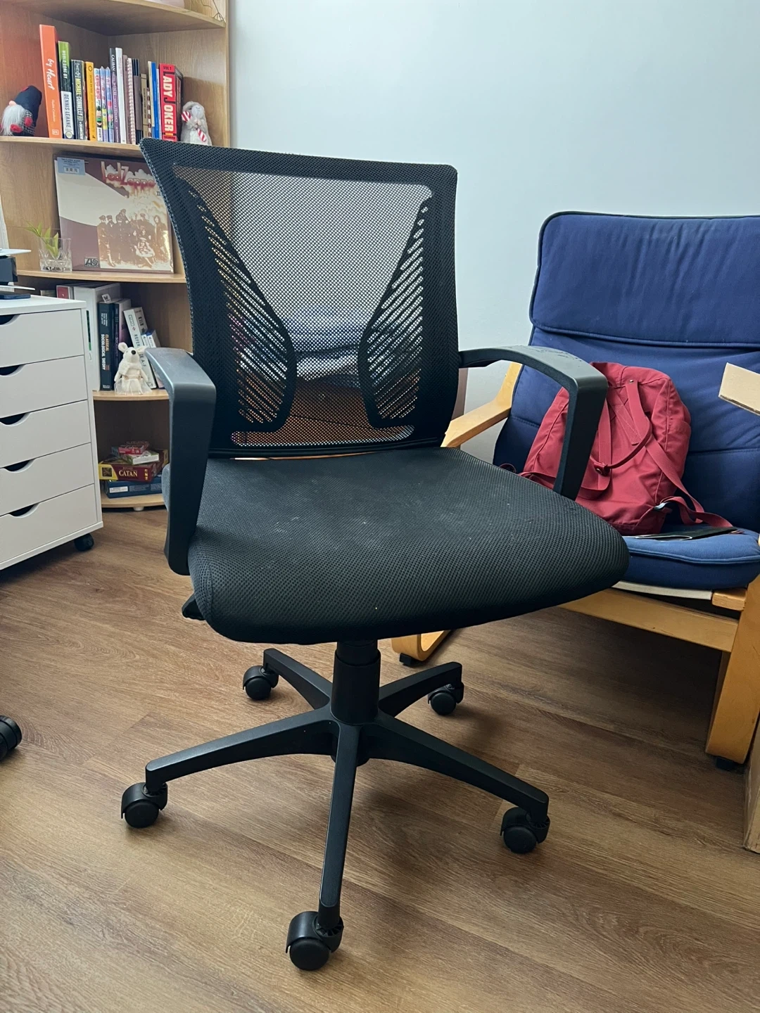 This is a black mesh office chair. It features a padded seat and a breathable mesh back. The chair is on wheels for easy mobility. It’s old but functional.