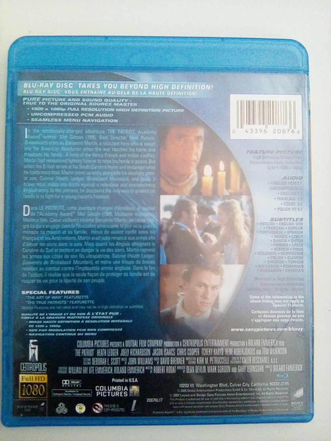 This is the extended cut of the Blu-Ray disc for the movie "The Patriot". It offers full HD resolution and includes seamless menu navigation. Audio options include English, French, and Spanish.