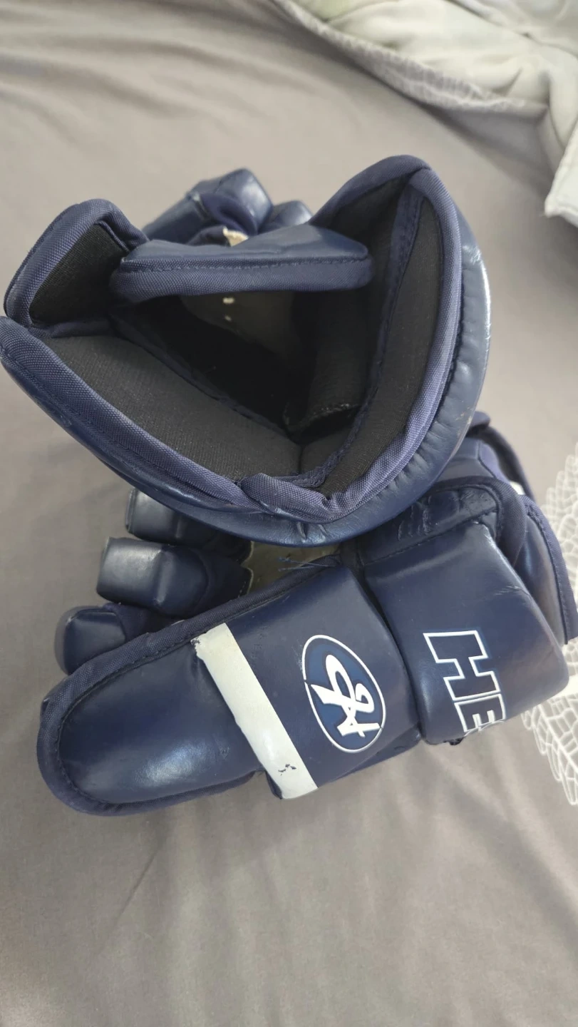 Navy blue Hespeler GT40 hockey gloves. These are a size 12.5 inch. They're made for hockey protection. Great for players looking for reliable hand gear.