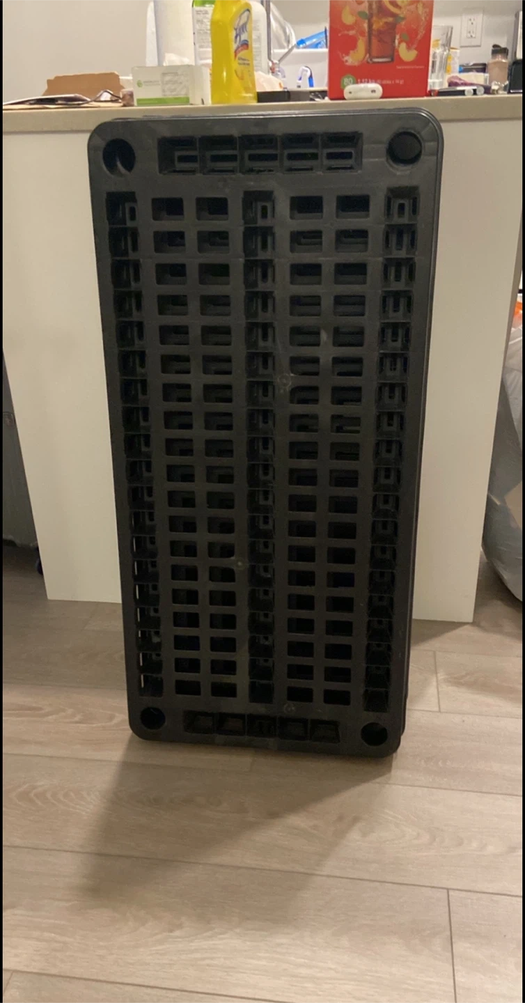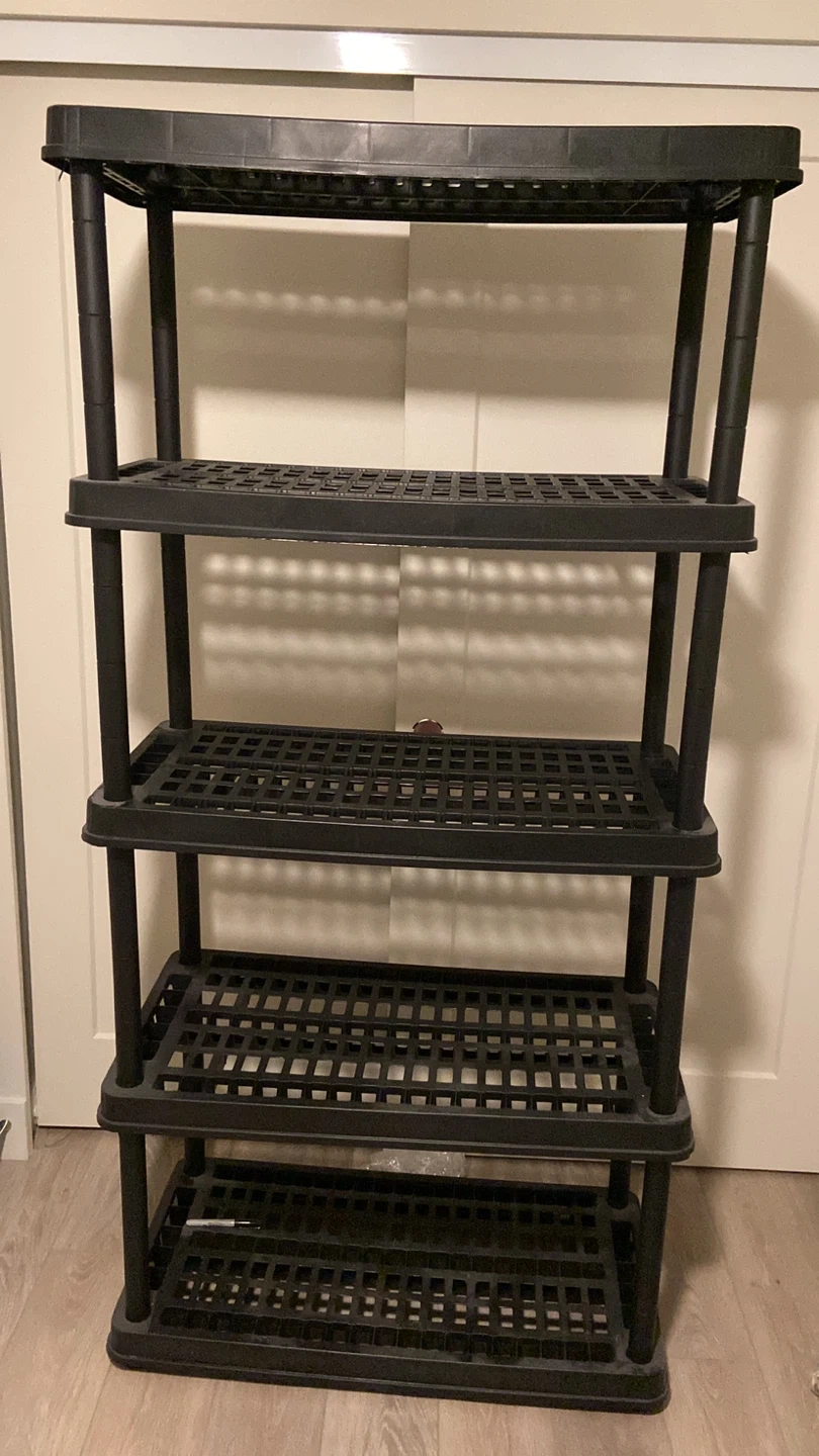 This black 5-tier shelving unit is made of durable heavy duty resin, with a 200lb capacity per shelf. It's perfect for organizing storage in garages, basements, or workshops. The open-weave shelves allow for good airflow.