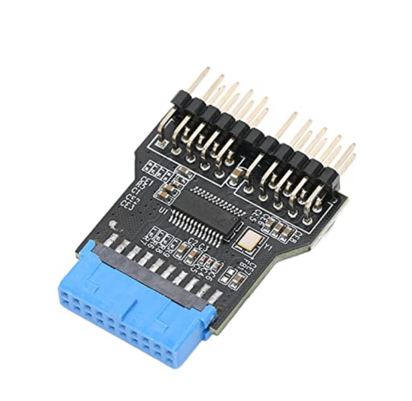 This adapter allows you to convert a USB 3.0 19-pin header to two USB 2.0 headers. It's useful for expanding your motherboard's USB connectivity. The adapter has a blue USB 3.0 19-pin connector on one end and multiple pins for USB 2.0 headers on the other.