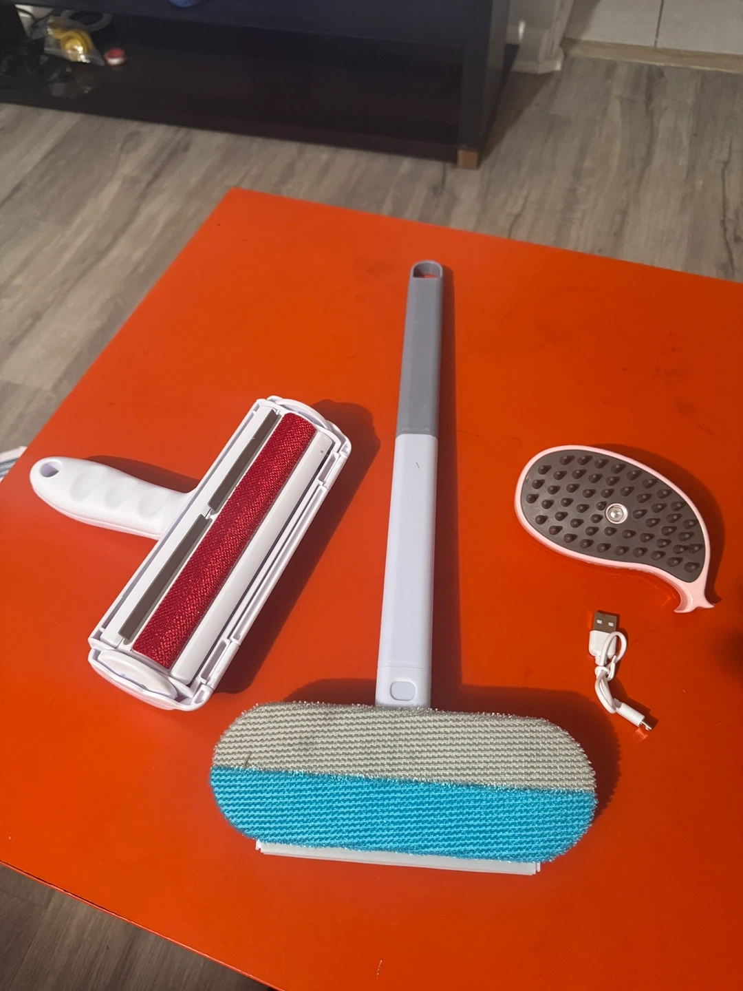This set includes a reusable lint roller, a fabric brush, and a pet hair remover tool. They're great for cleaning up lint, fuzz, and pet hair from furniture and clothing. The pet hair remover is powered and comes with a USB charging cable.