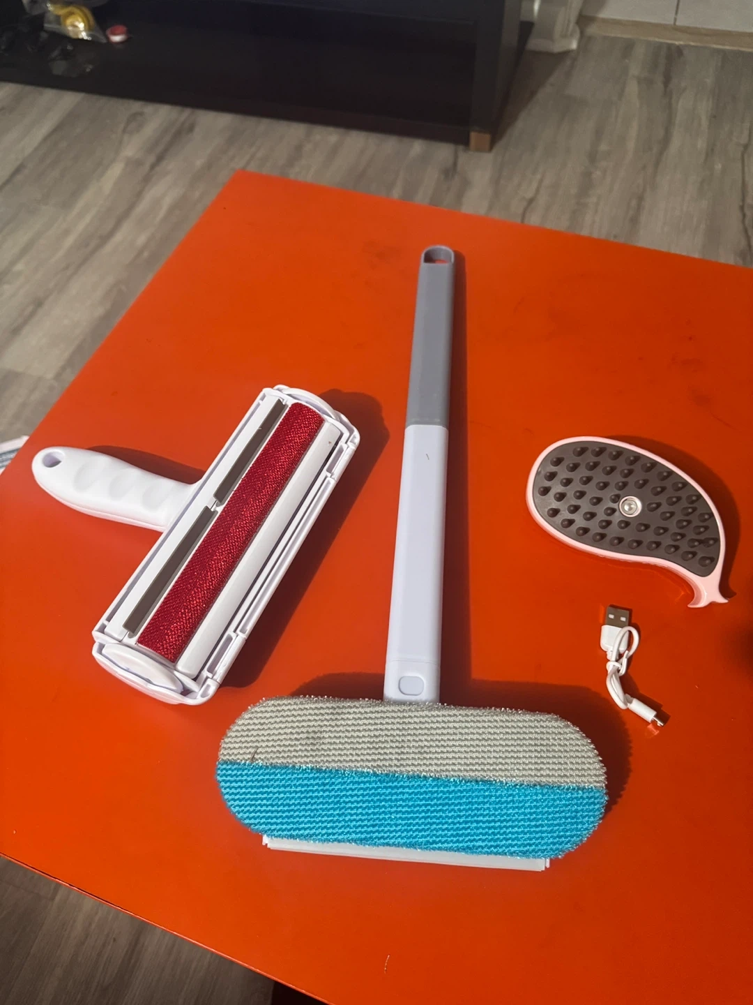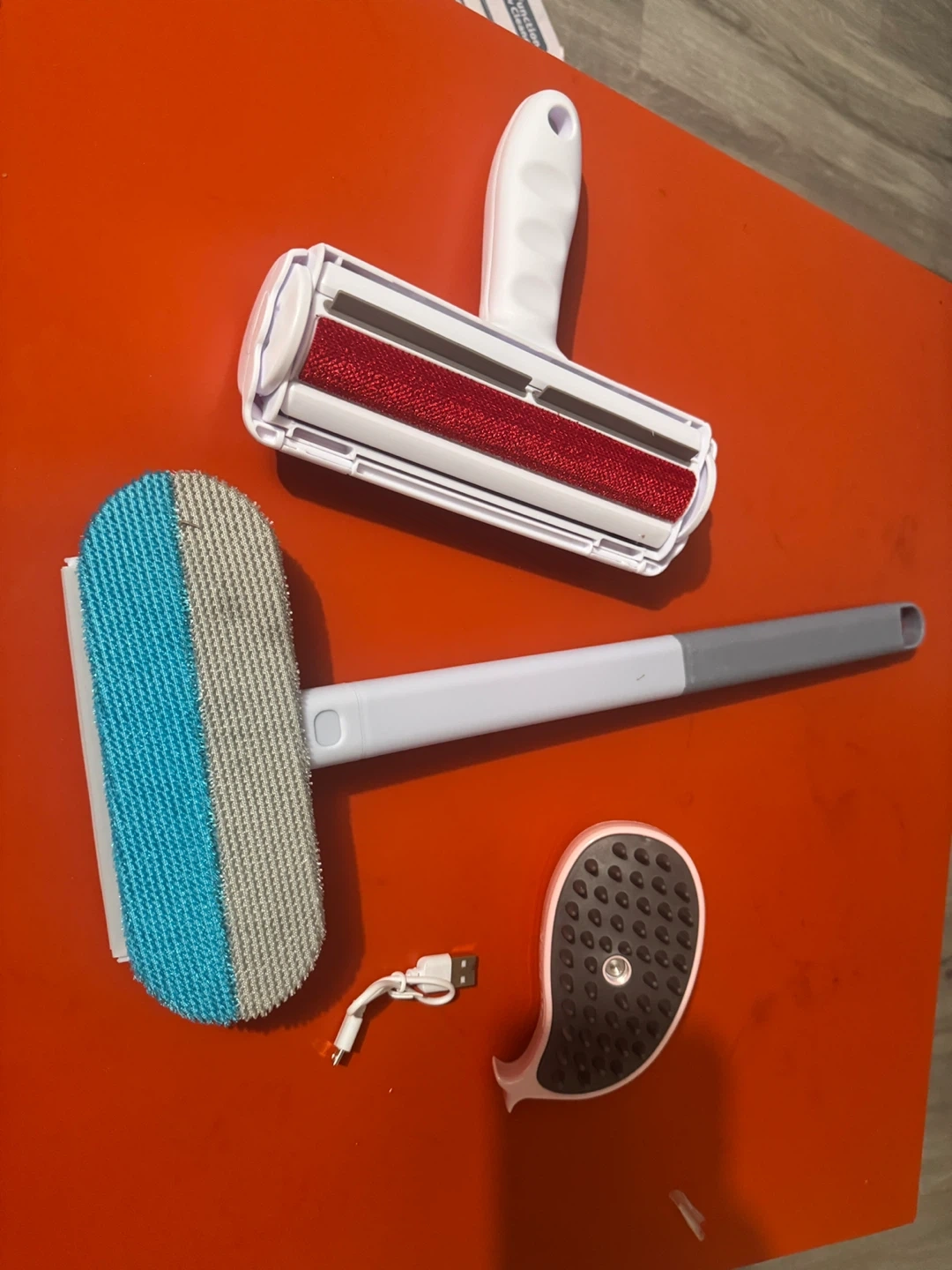 This set includes a reusable lint roller, a fabric brush, and a pet hair remover tool. They're great for cleaning up lint, fuzz, and pet hair from furniture and clothing. The pet hair remover is powered and comes with a USB charging cable.