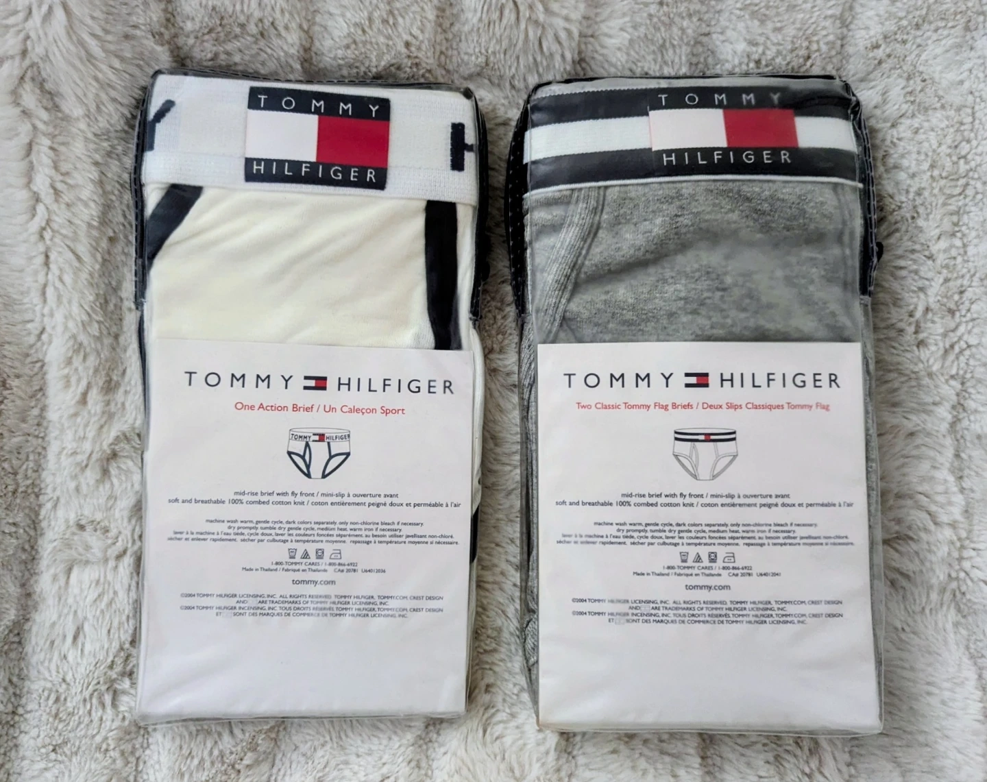 Brand new 2 pairs of Tommy Hilfiger Classic Flag Briefs in gray and 1 One Action Brief in white. They're made of soft and breathable 100% combed cotton knit.