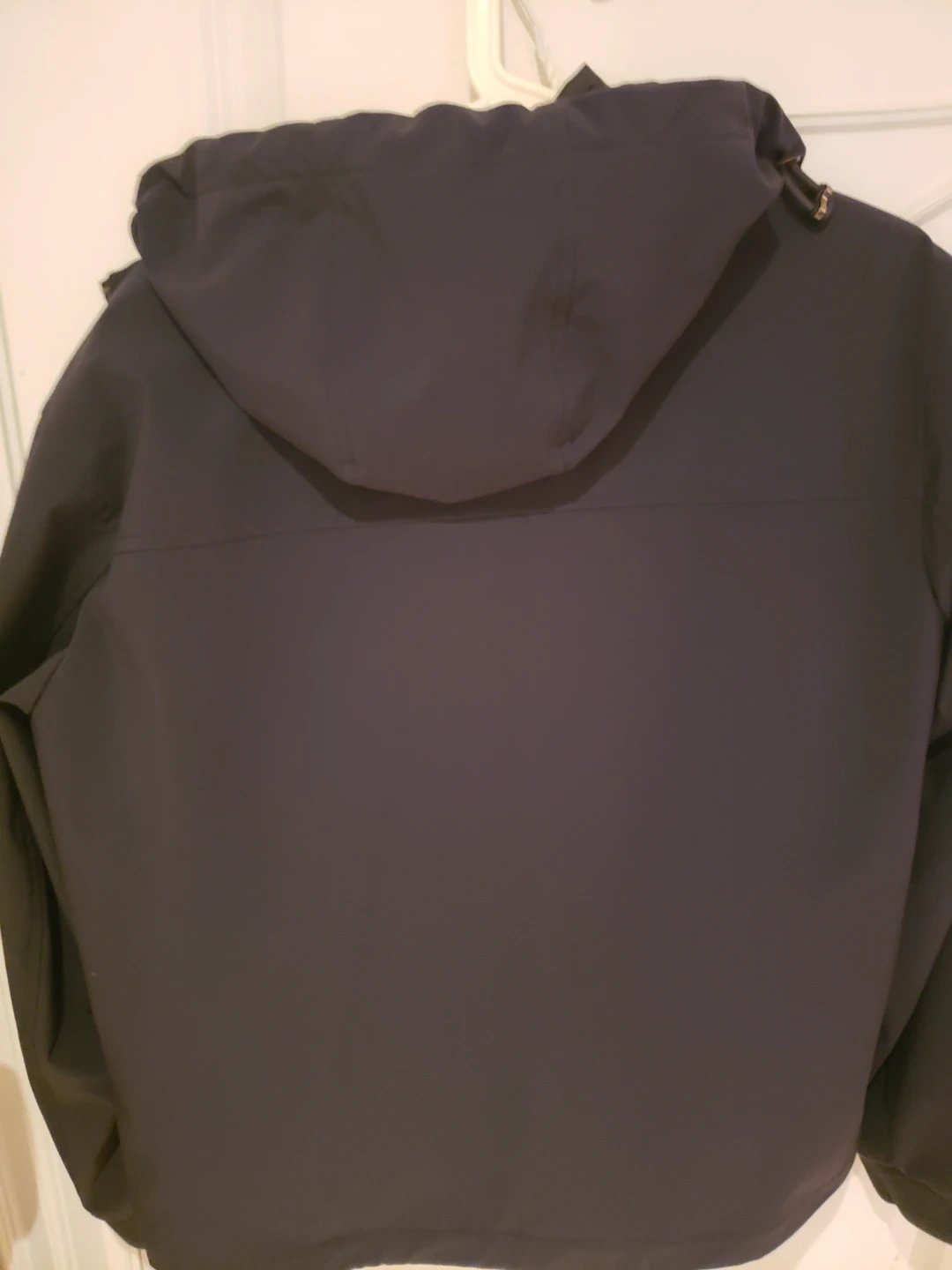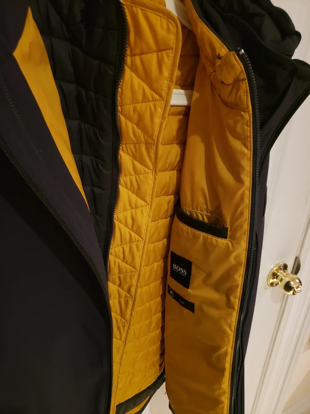 This BOSS jacket features a black exterior and a vibrant yellow quilted interior lining. It has a full zip closure and two zip pockets on the front. The jacket also includes an inner pocket... only cash 💸 ..spring and fall