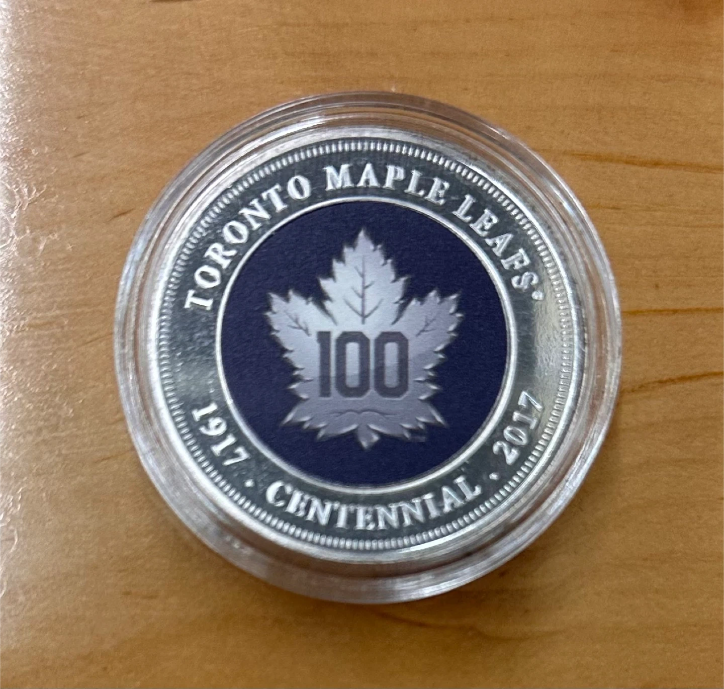 This coin celebrates the 100th anniversary of the Toronto Maple Leafs. It features various logos from different years. Minted 2017.