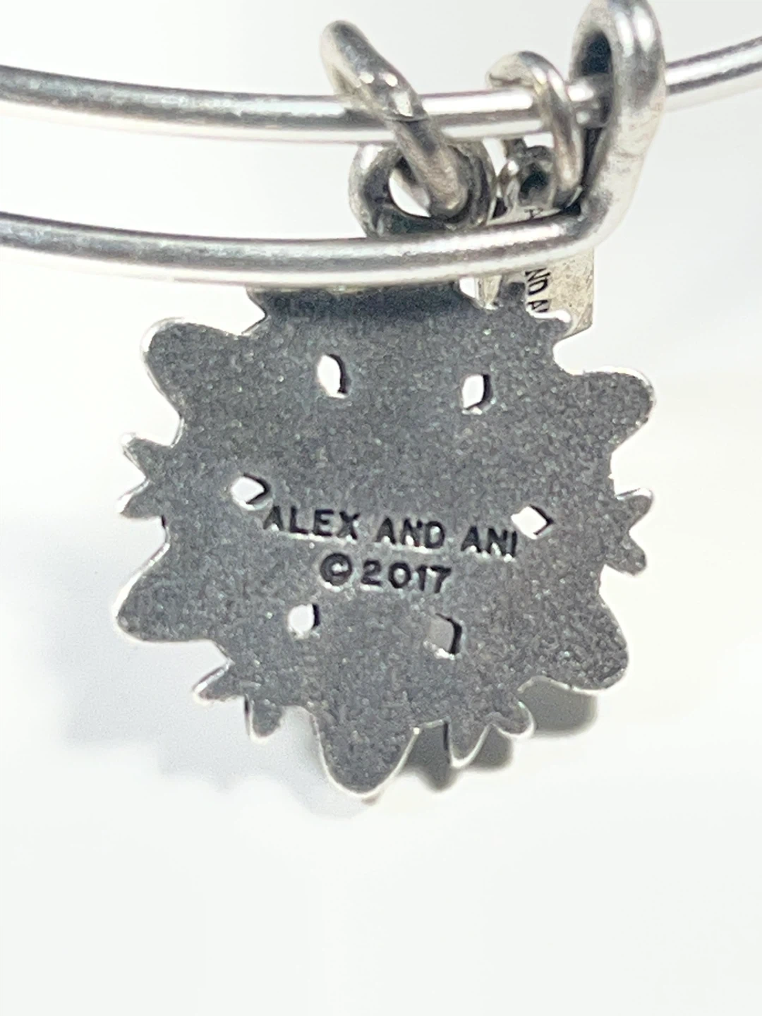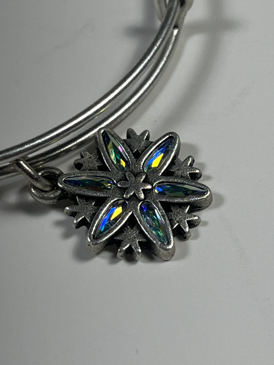 Alex and Ani silver-toned expandable bangle bracelet. It features a snowflake charm with iridescent crystal accents. Infused with energy technology. Dated 2017.