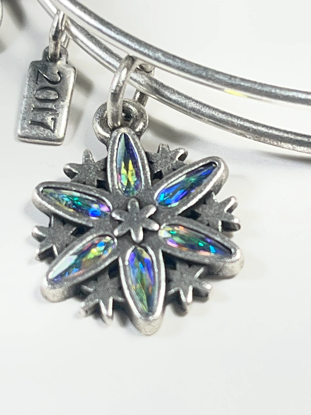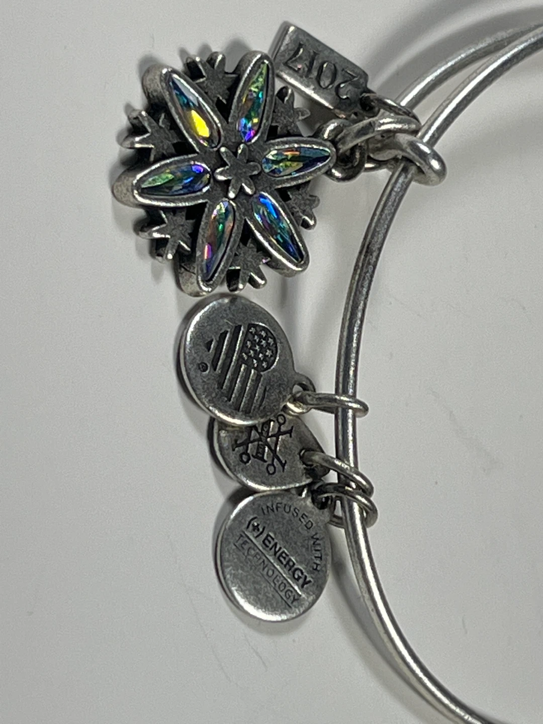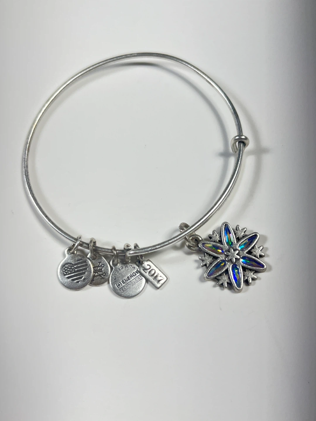 Alex and Ani silver-toned expandable bangle bracelet. It features a snowflake charm with iridescent crystal accents. Infused with energy technology. Dated 2017.