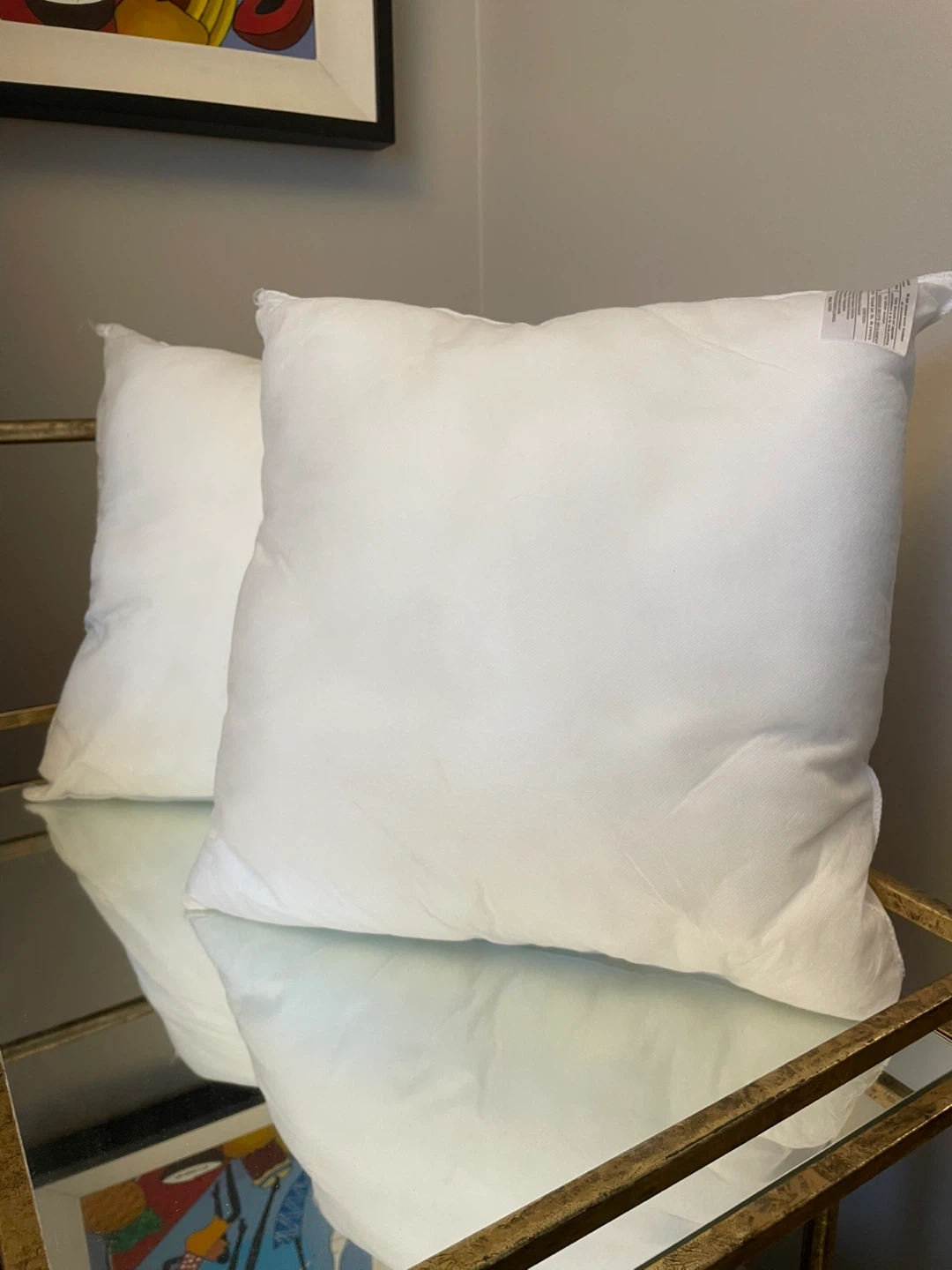 Two white pillow inserts for your throw pillows. These are standard size inserts ready to be covered. They're soft and plump, perfect for adding comfort to any couch or armchair.