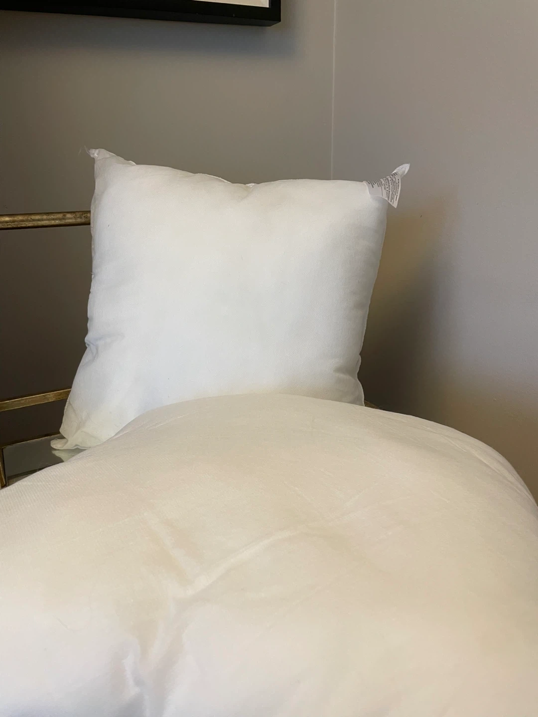 Two white pillow inserts for your throw pillows. These are standard size inserts ready to be covered. They're soft and plump, perfect for adding comfort to any couch or armchair.