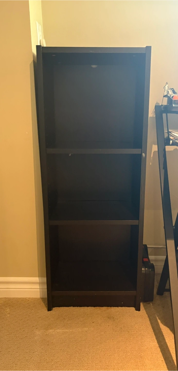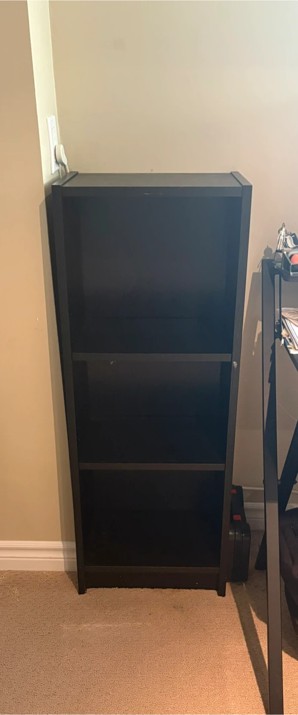IKEA dark brown bookcase with three shelves. It's perfect for organizing books or display items. Its compact size makes it suitable for smaller spaces.