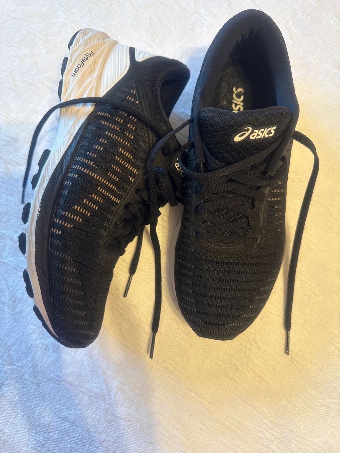 These ASICS running shoes are black. They feature a lightweight mesh upper and cushioned sole. Great for hitting the pavement or the gym!