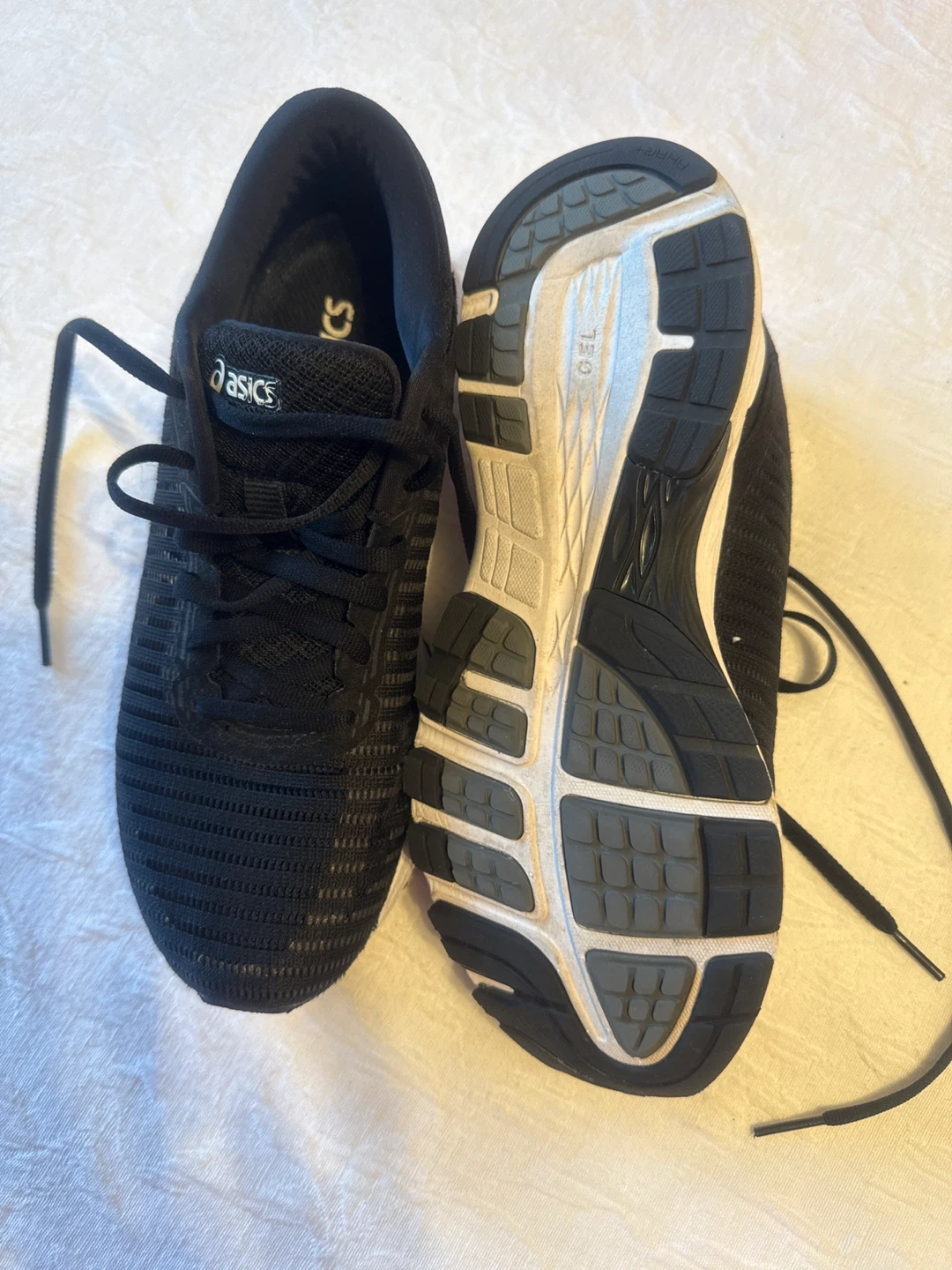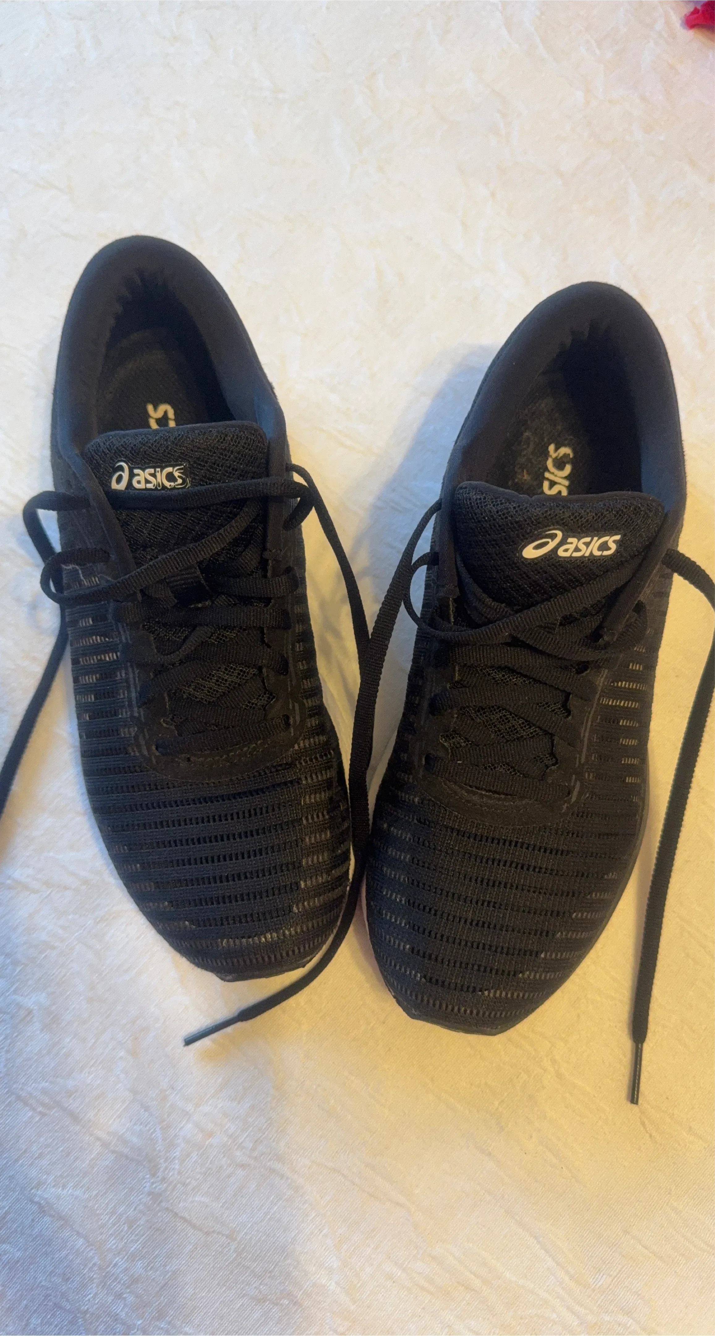 These ASICS running shoes are black. They feature a lightweight mesh upper and cushioned sole. Great for hitting the pavement or the gym!