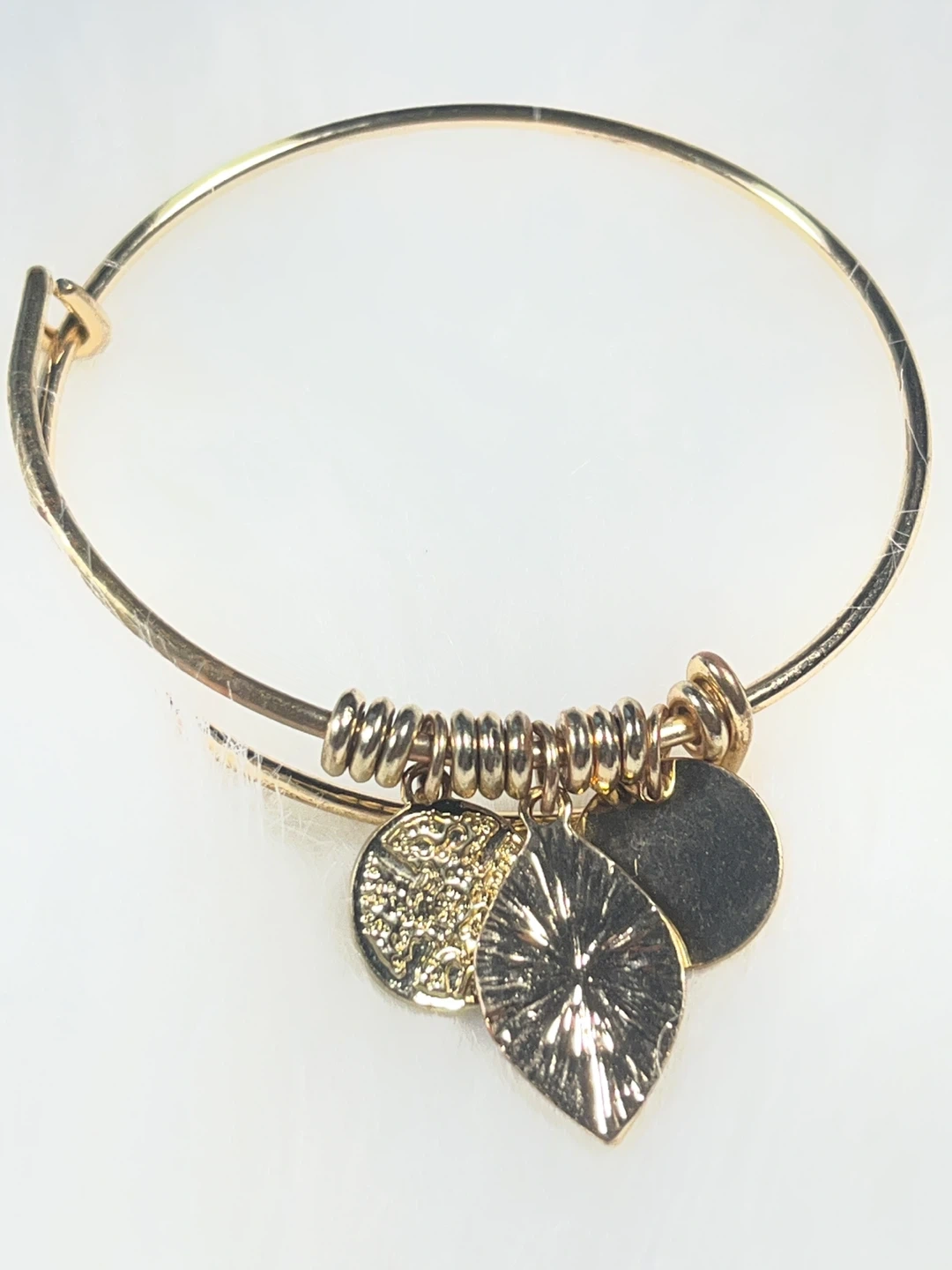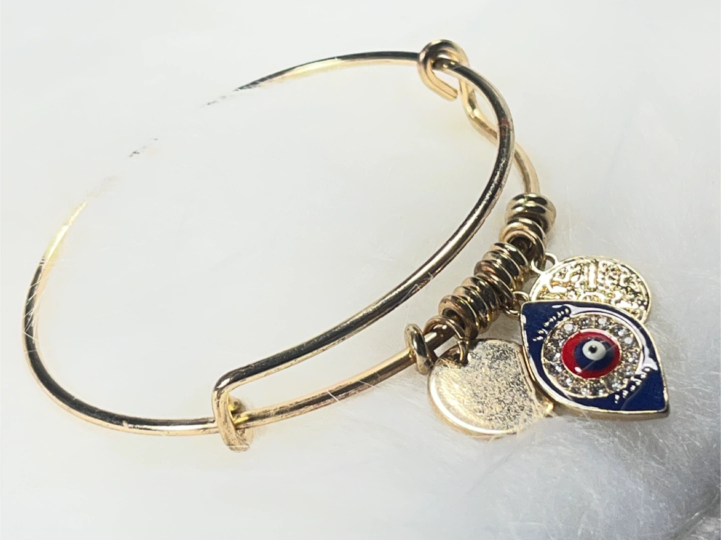 This gold-tone bangle bracelet features a decorative evil eye charm and three other hanging charms. It's an adjustable bangle with a classic design. Perfect for adding a touch of protection and style to any outfit!