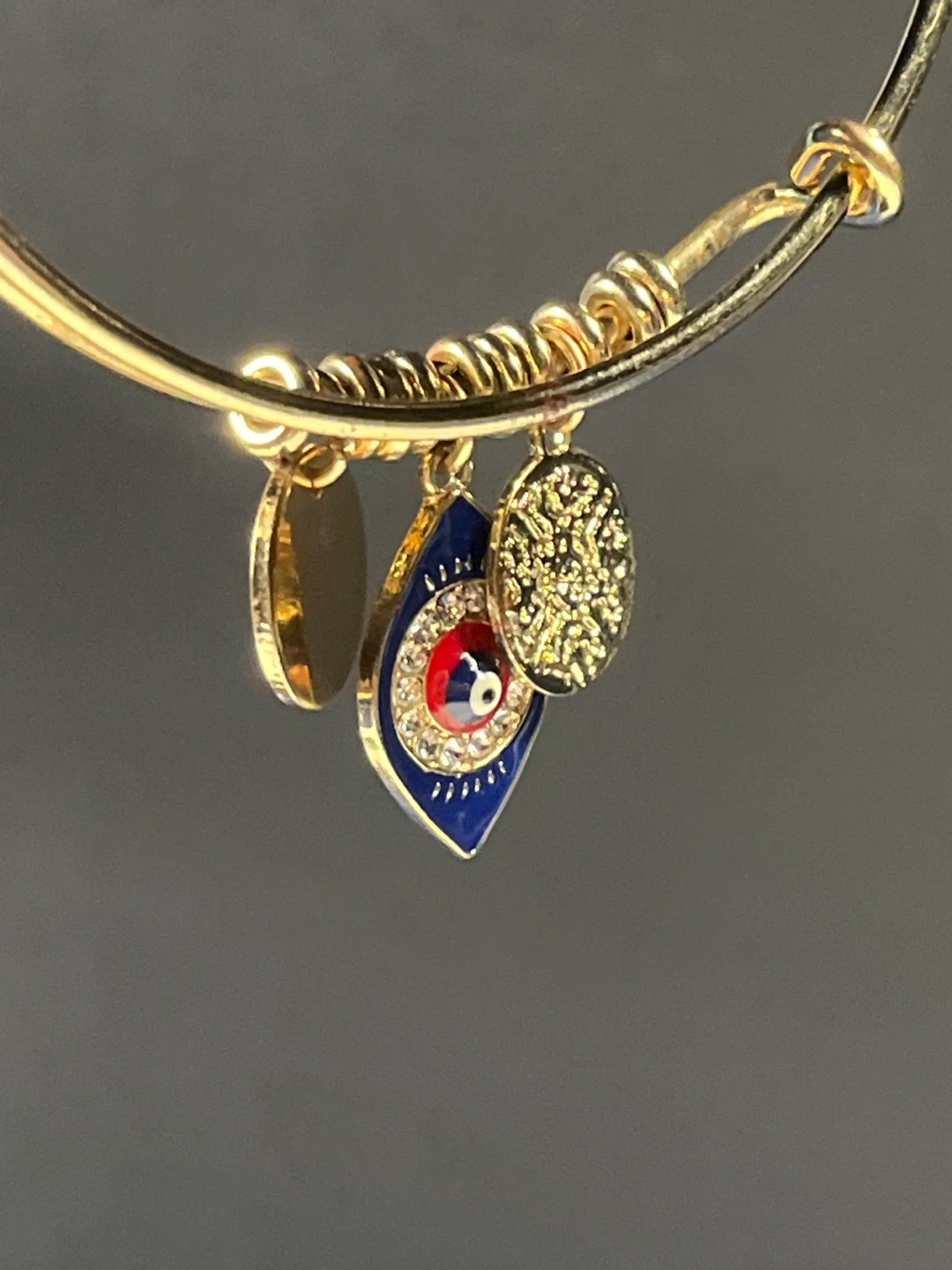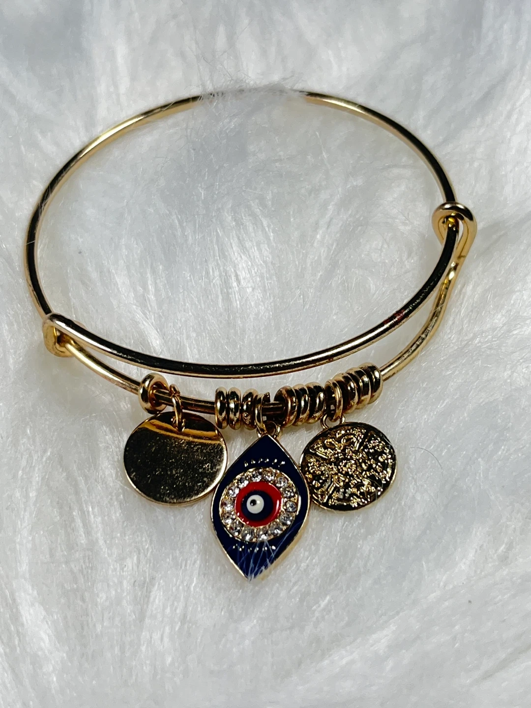 This gold-tone bangle bracelet features a decorative evil eye charm and three other hanging charms. It's an adjustable bangle with a classic design. Perfect for adding a touch of protection and style to any outfit!