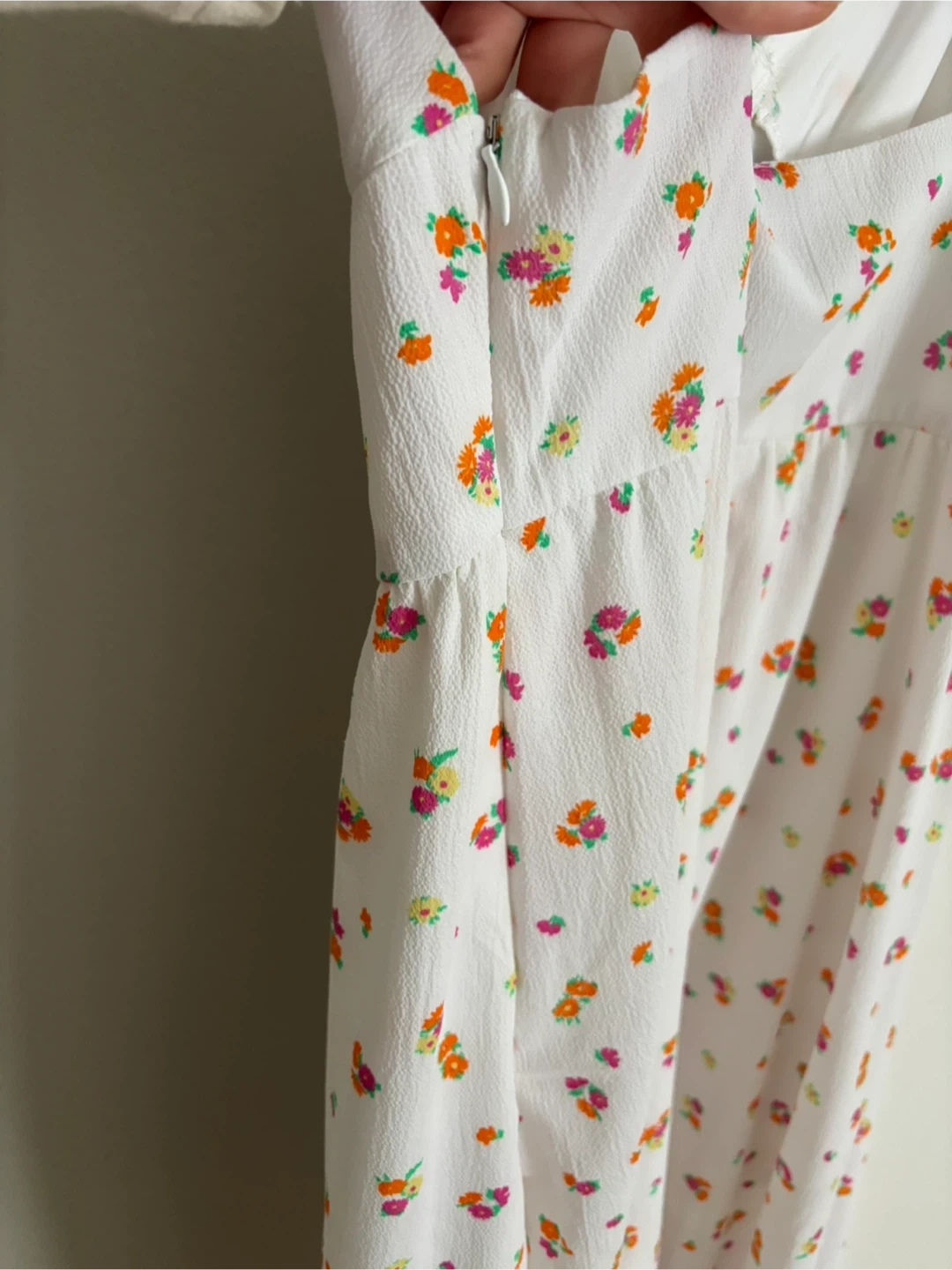 White sundress with a colourful floral print in great condition.Features a V-neck and a side slit. Size L