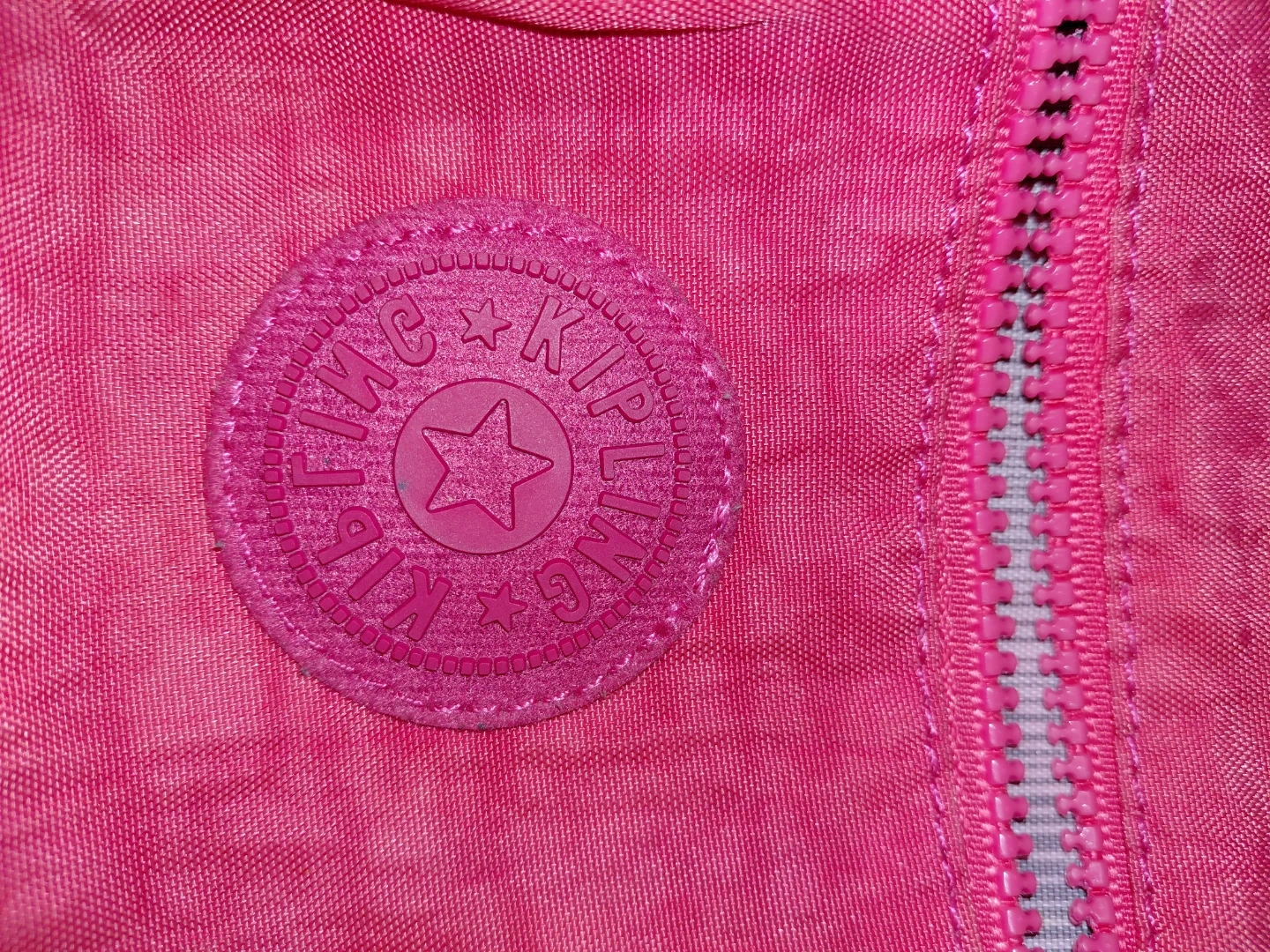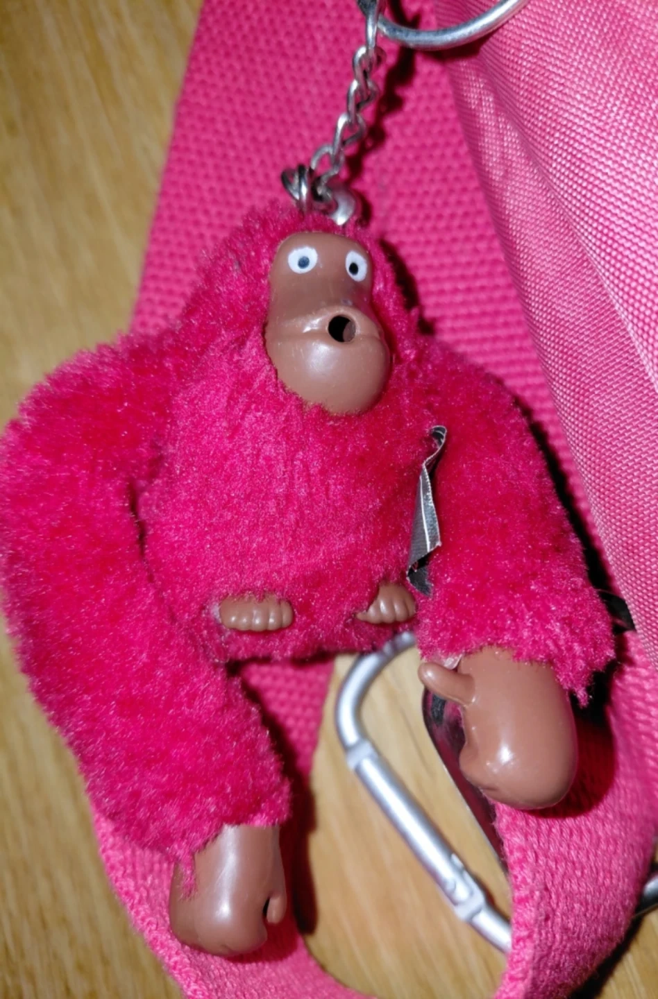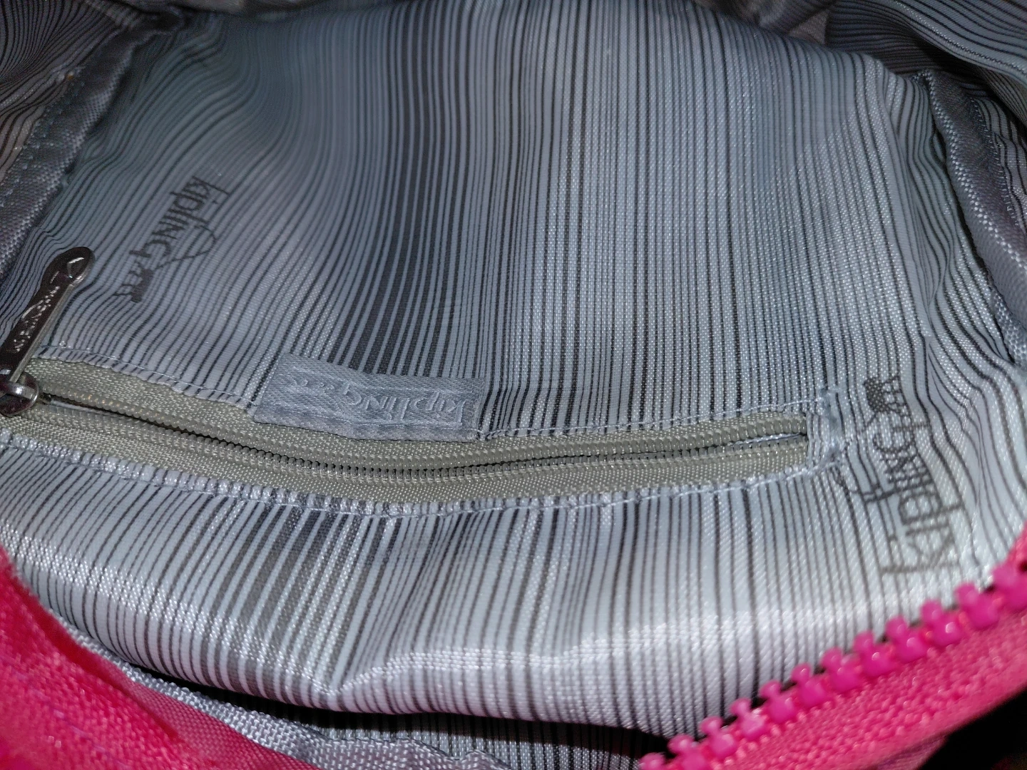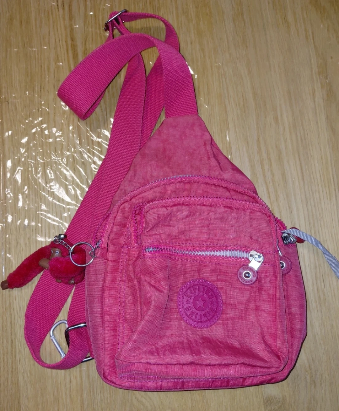 This is a Kipling pink sling mini backpack. It's made of nylon and features multiple zippered compartments for youy essencials. It comes with the classic Kipling monkey keychain!