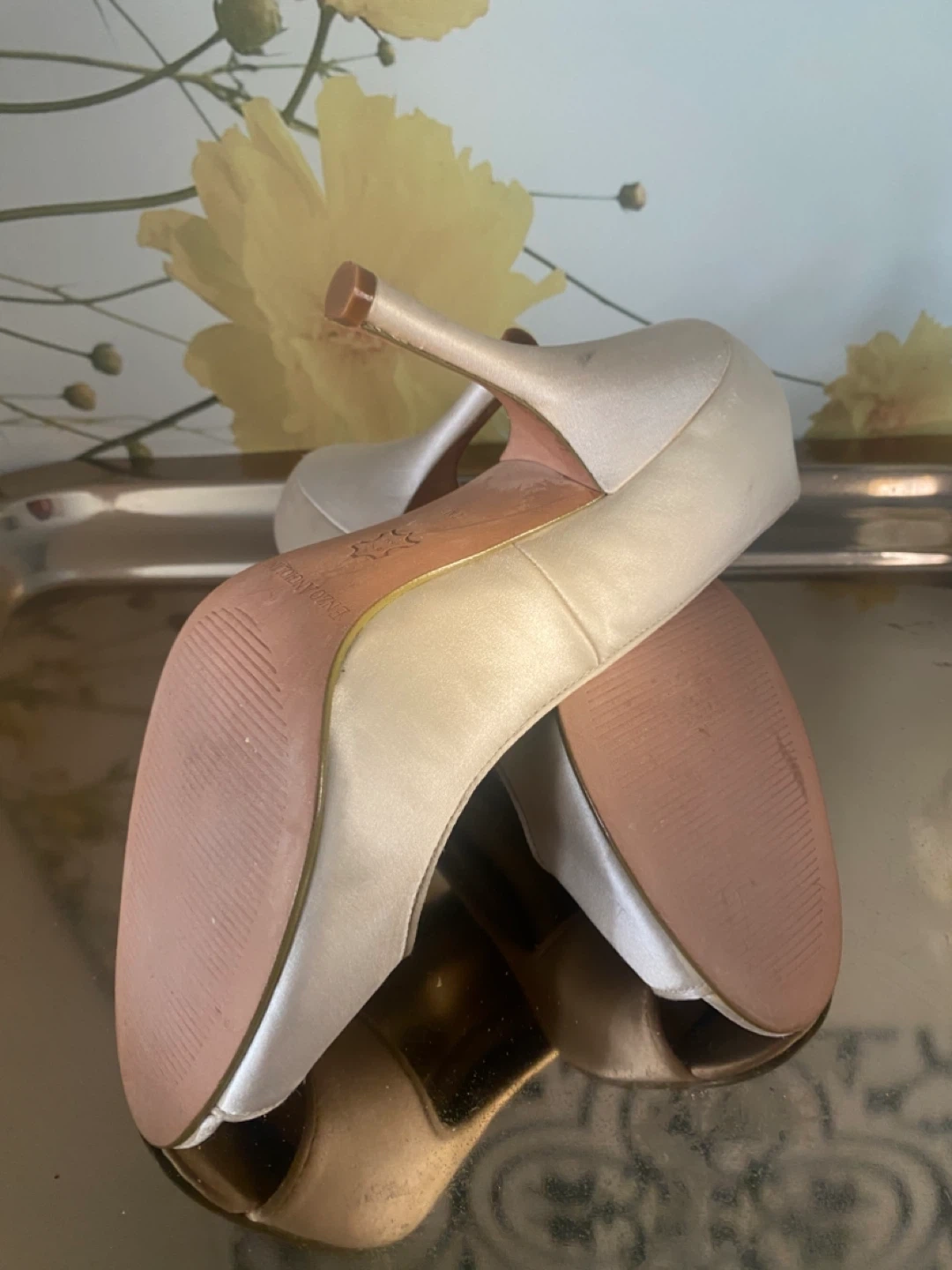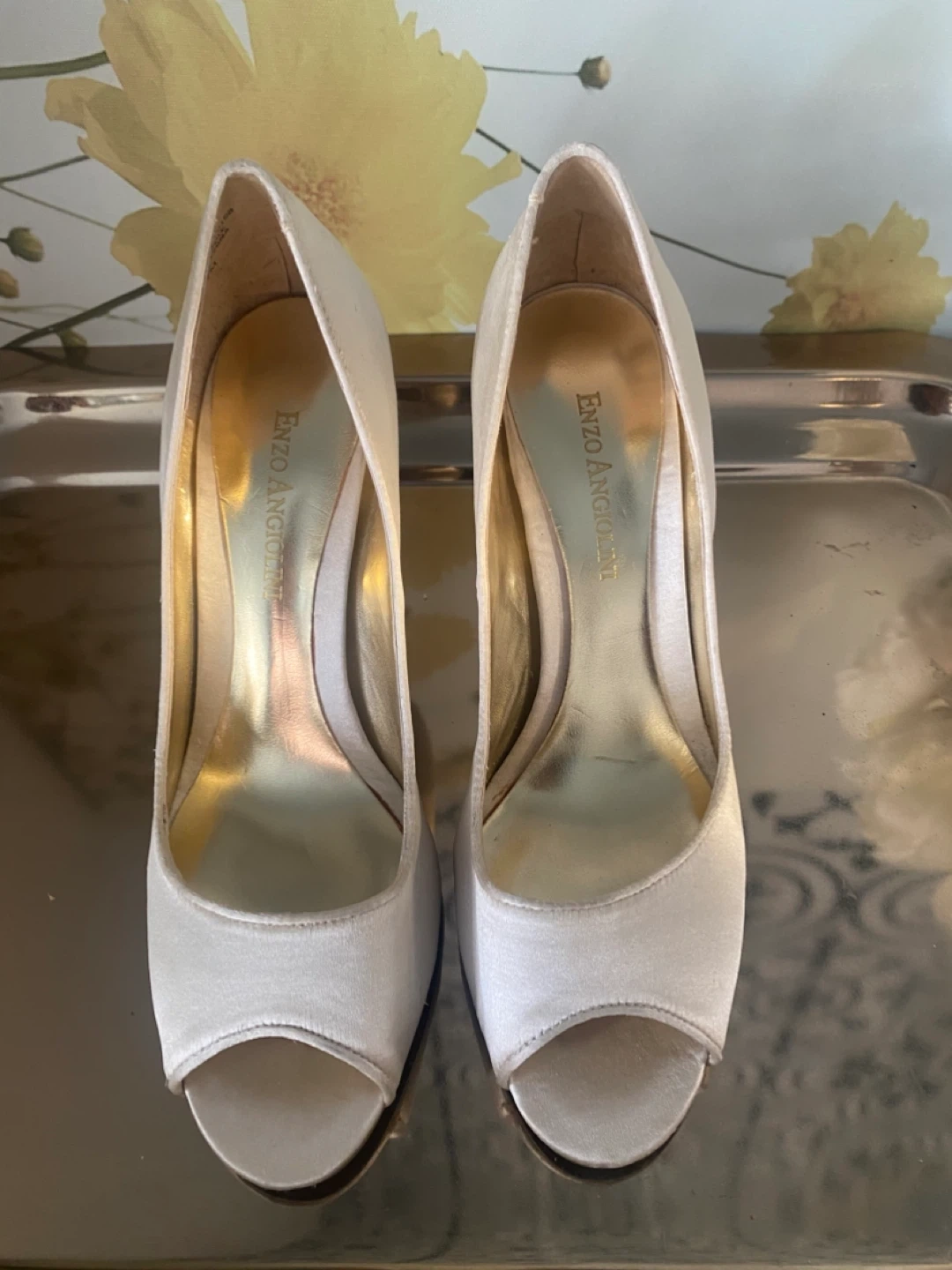 These Enzo Angiolini peep toe heels are a classic cream color. They feature a stylish silhouette perfect for dressy occasions. The inside of the shoe is a shiny gold. Follow me.@casa_s_decor