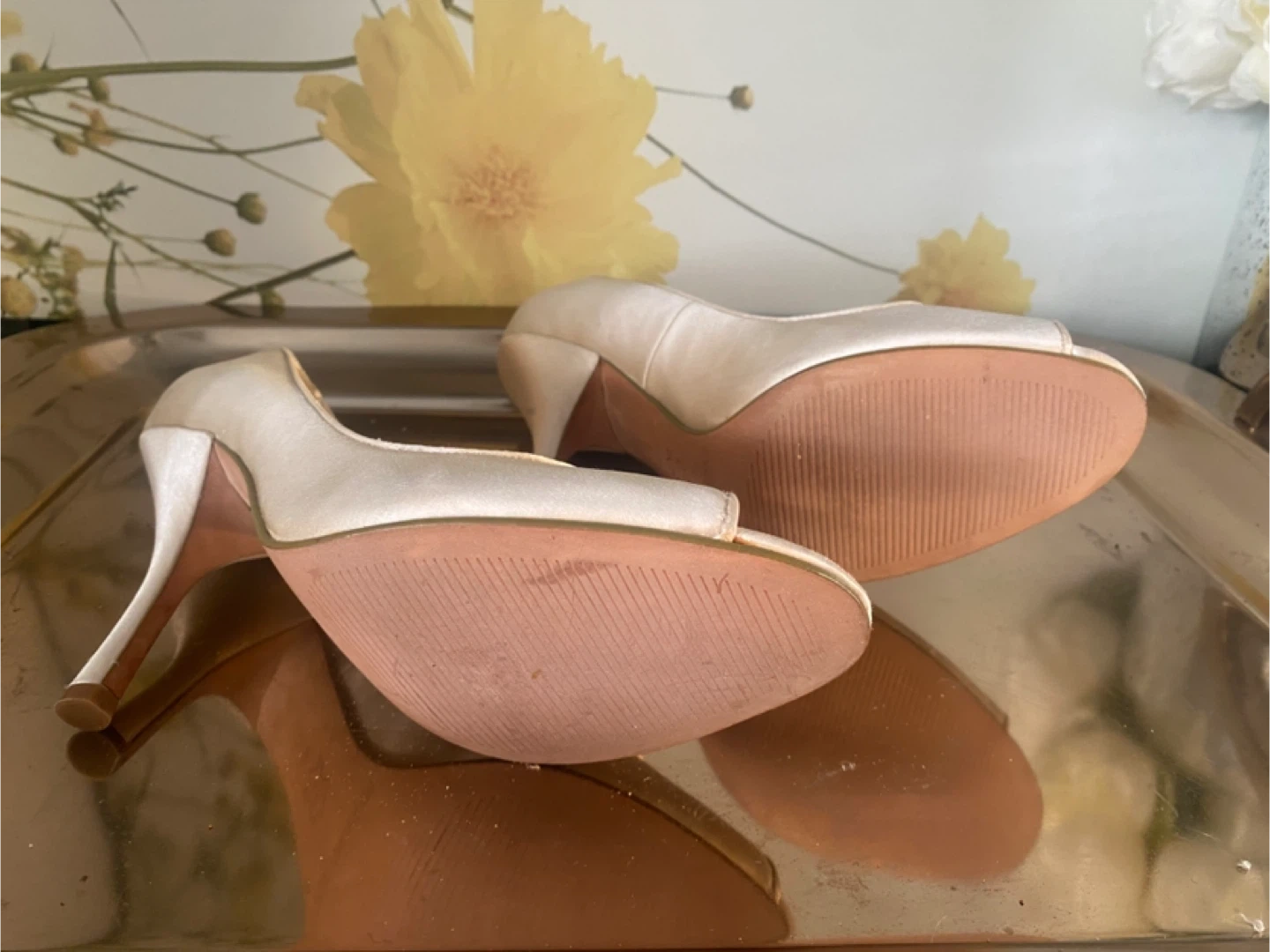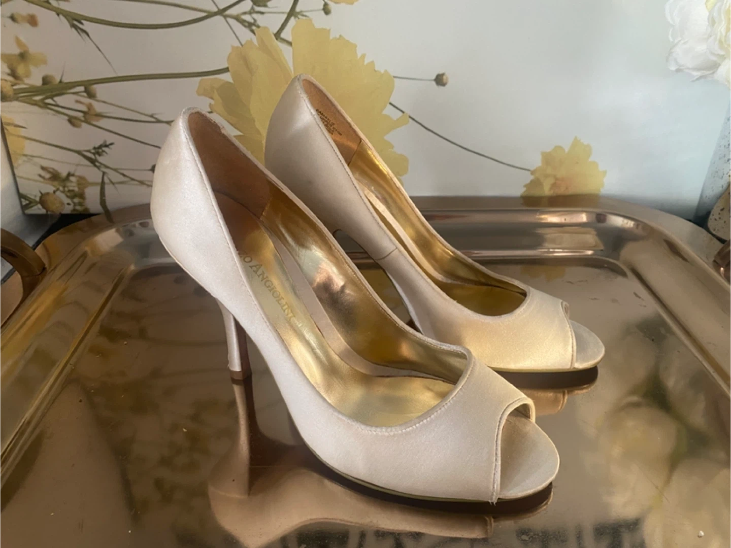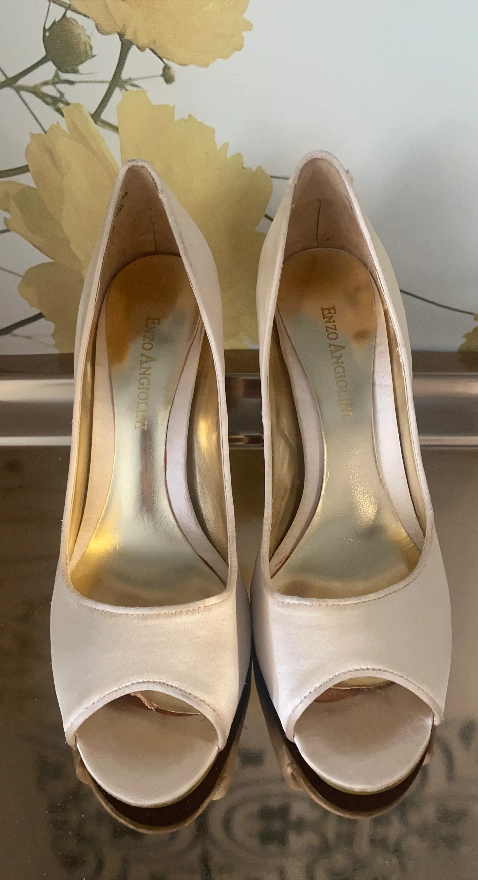 These Enzo Angiolini peep toe heels are a classic cream color. They feature a stylish silhouette perfect for dressy occasions. The inside of the shoe is a shiny gold. Follow me.@casa_s_decor