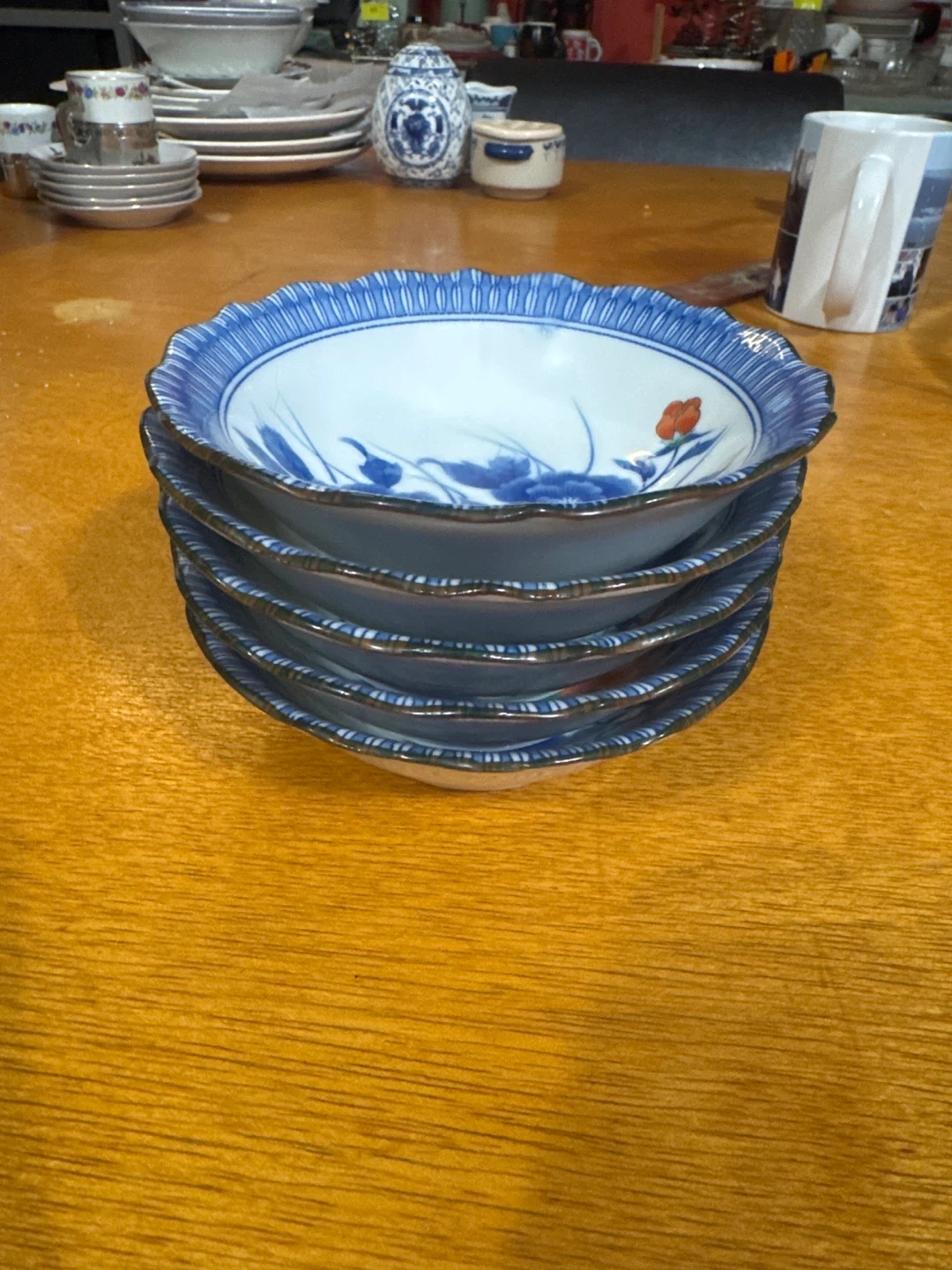 This is a set of five ceramic bowls. They feature a blue and white floral design with a scalloped edge. These bowls are perfect for serving individual portions or holding snacks. Dishwasher safe.