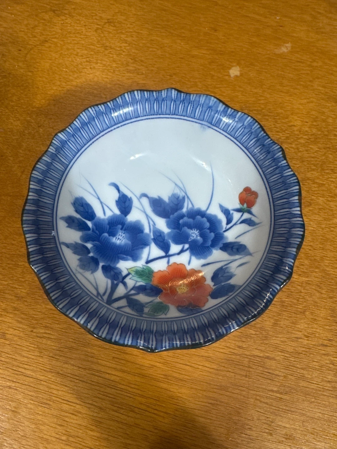 This is a set of five ceramic bowls. They feature a blue and white floral design with a scalloped edge. These bowls are perfect for serving individual portions or holding snacks. Dishwasher safe.