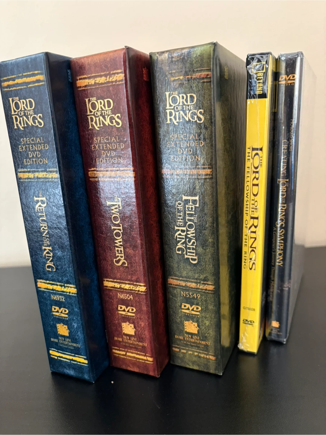 This set includes The Fellowship of the Ring, The Two Towers, and The Return of the King, all in their special extended DVD editions. It also includes the "Creating the Lord of the Rings Symphony" DVD. These discs are from the New Line Platinum Series.