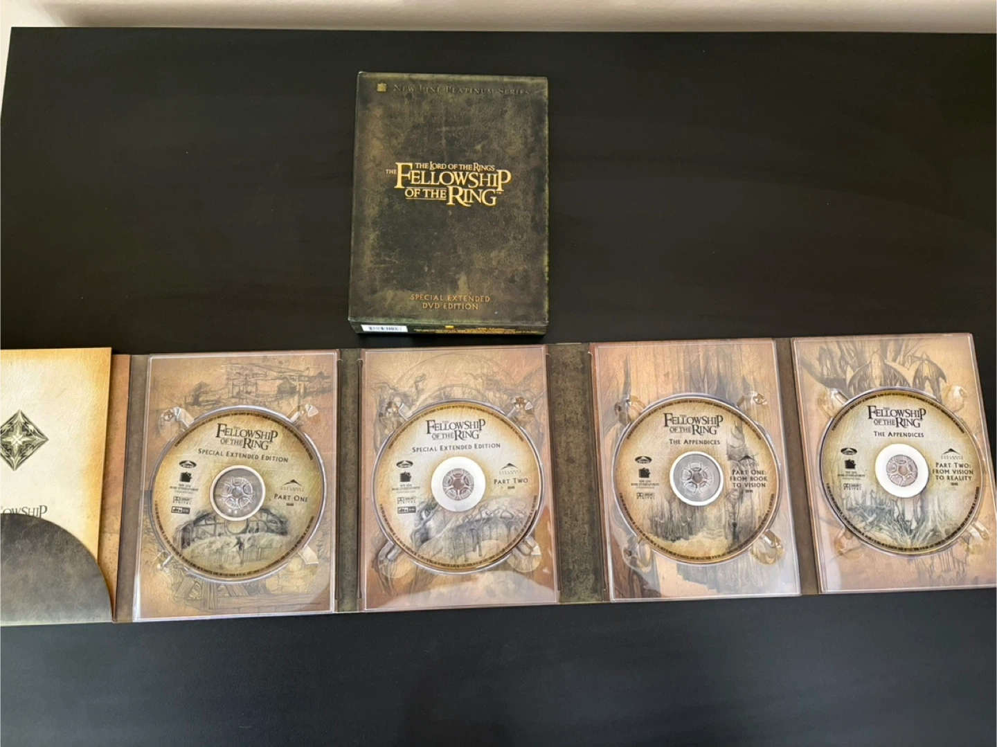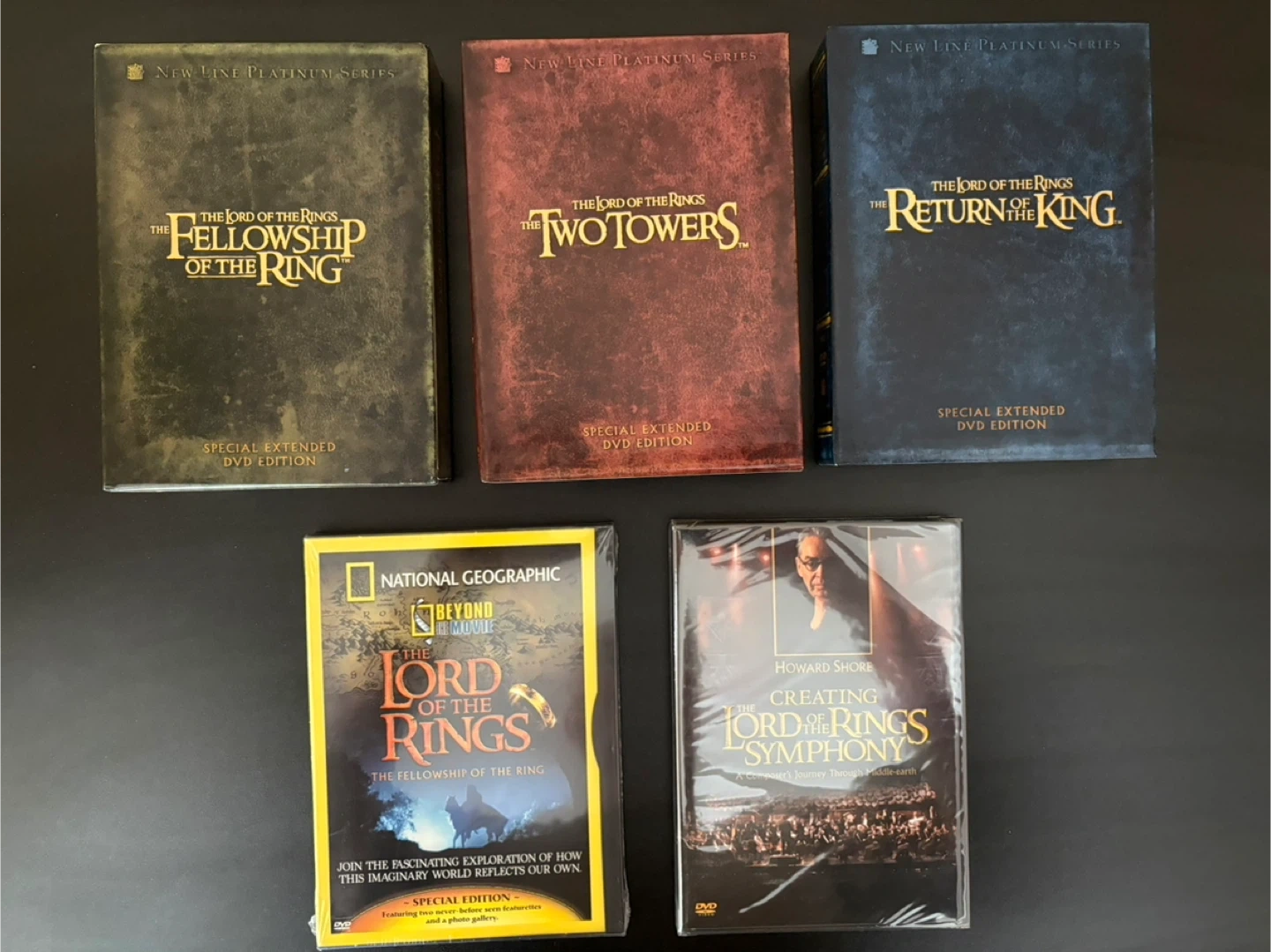 This set includes The Fellowship of the Ring, The Two Towers, and The Return of the King, all in their special extended DVD editions. It also includes the "Creating the Lord of the Rings Symphony" DVD. These discs are from the New Line Platinum Series.