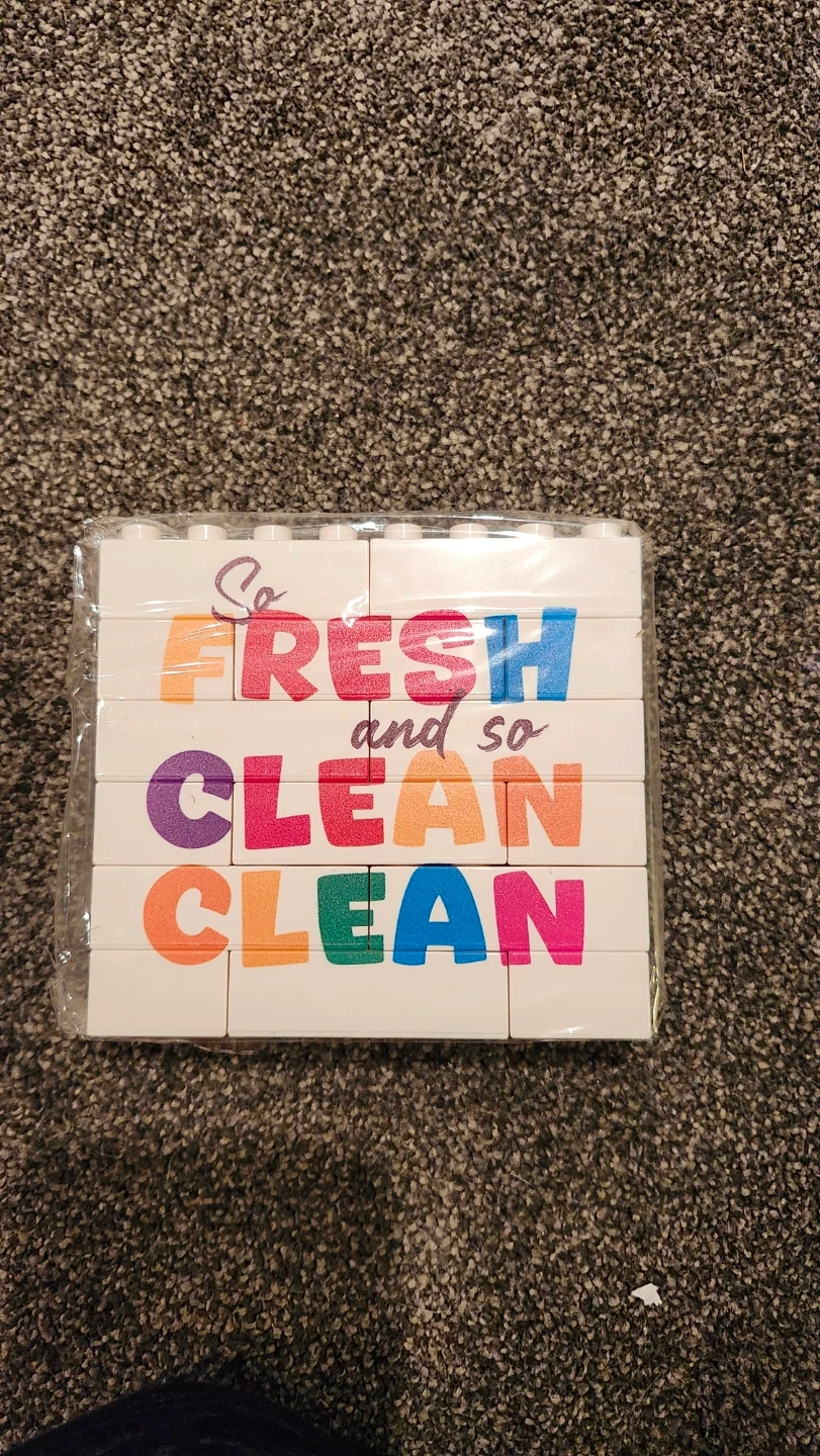 These decorative signs feature brick-style construction with colourful lettering. One sign says 'FLUSH the toilet WASH your hand' and the other says 'So FRESH and so CLEAN CLEAN'. They're perfect for a bathroom or laundry room!