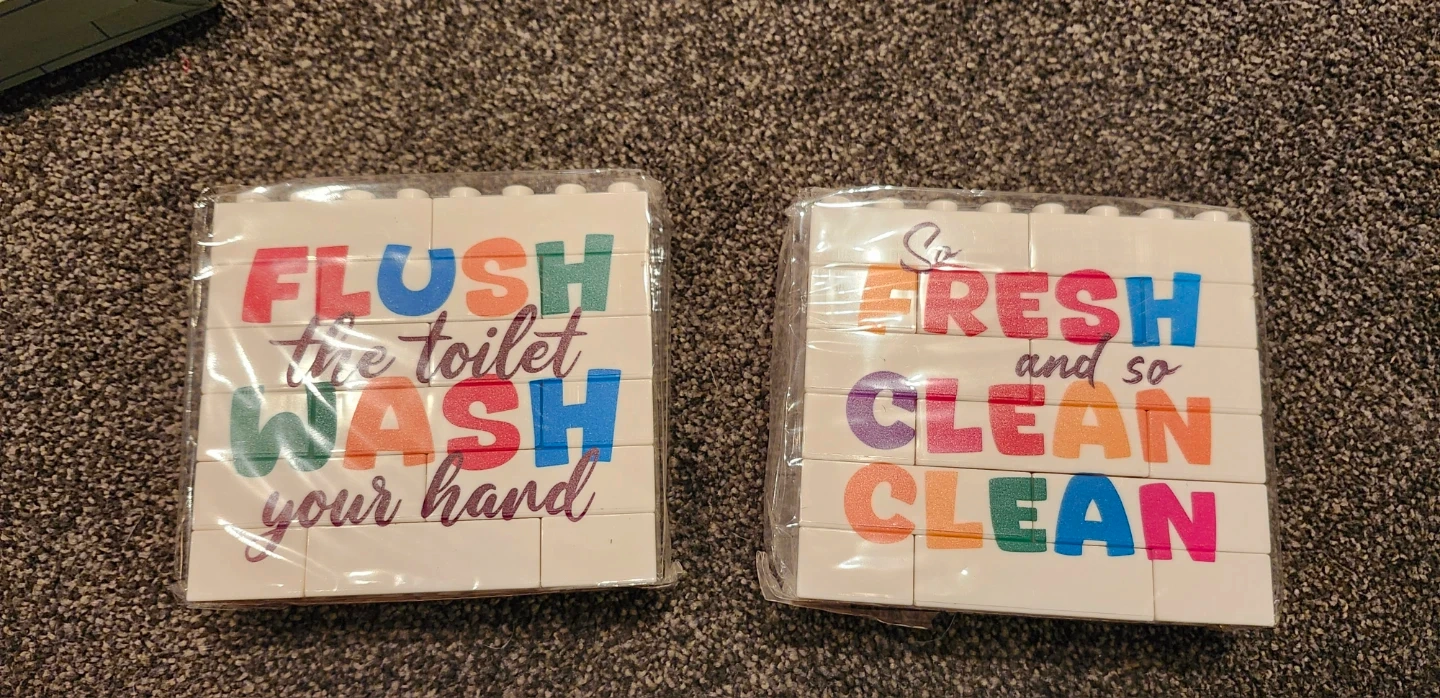 These decorative signs feature brick-style construction with colourful lettering. One sign says 'FLUSH the toilet WASH your hand' and the other says 'So FRESH and so CLEAN CLEAN'. They're perfect for a bathroom or laundry room!