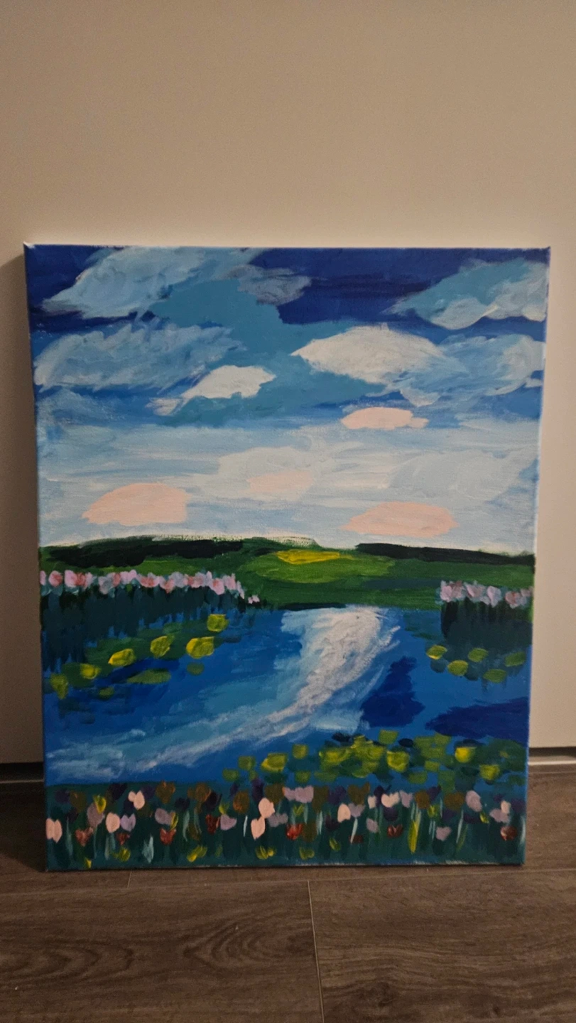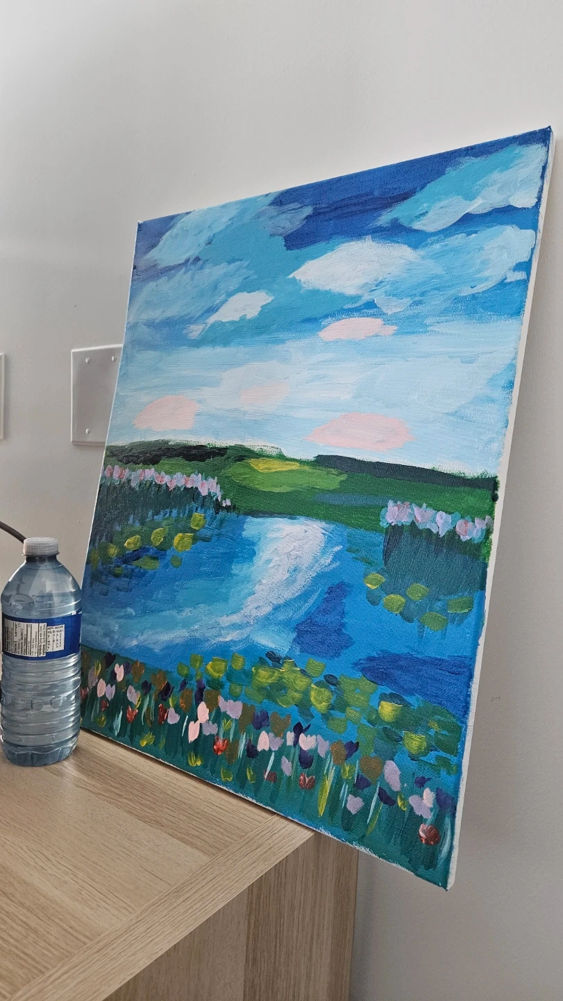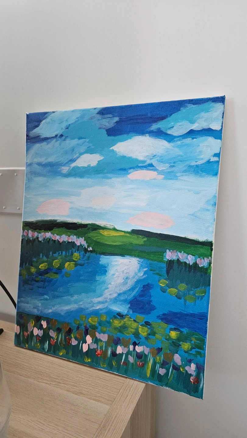 A bright and colourful original painting of a serene lake scene. It depicts a tranquil body of water with water lilies and fluffy clouds in a blue sky.