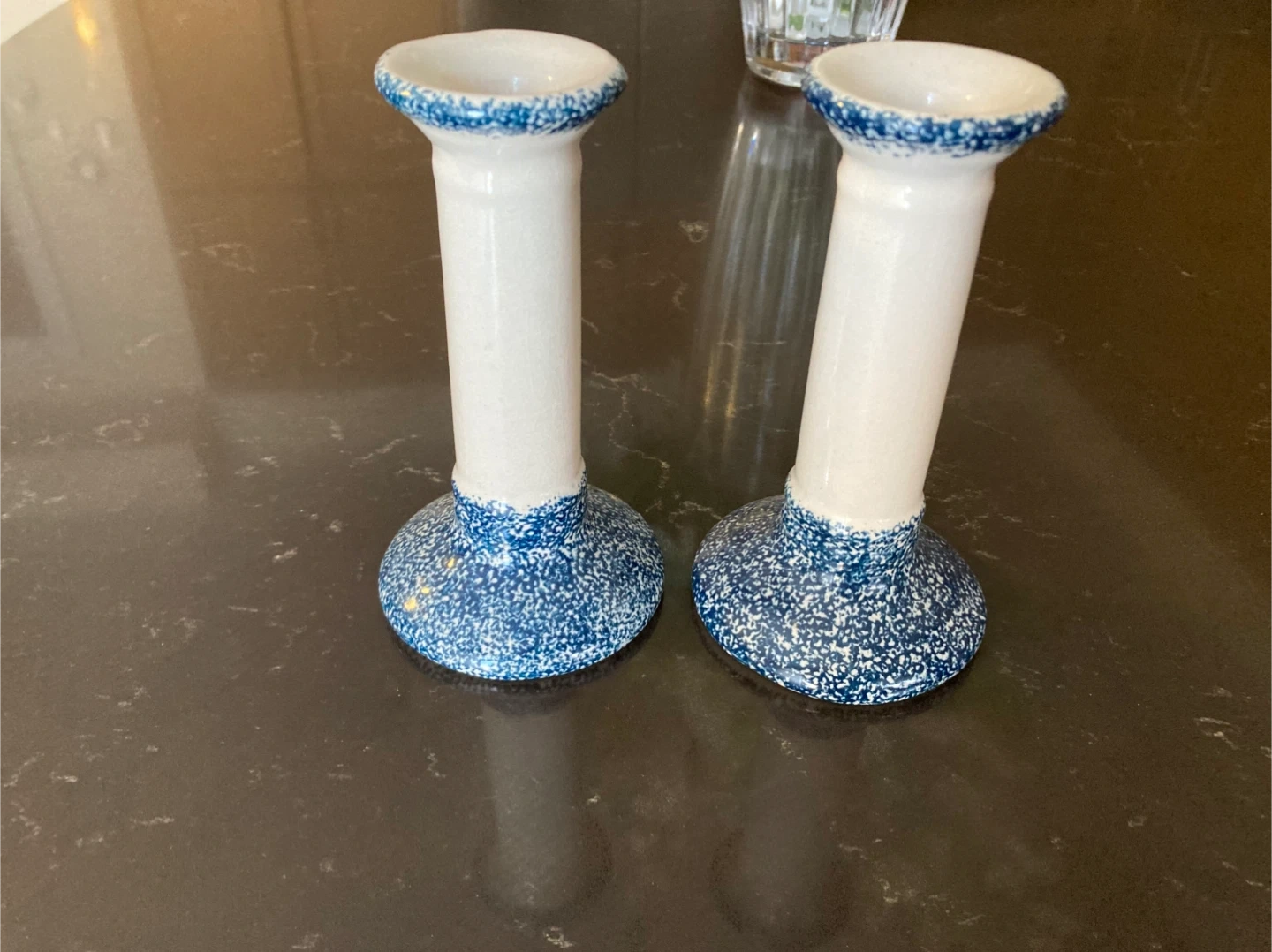 Pair of Ceramic Candlesticks - Blue and White Speckled