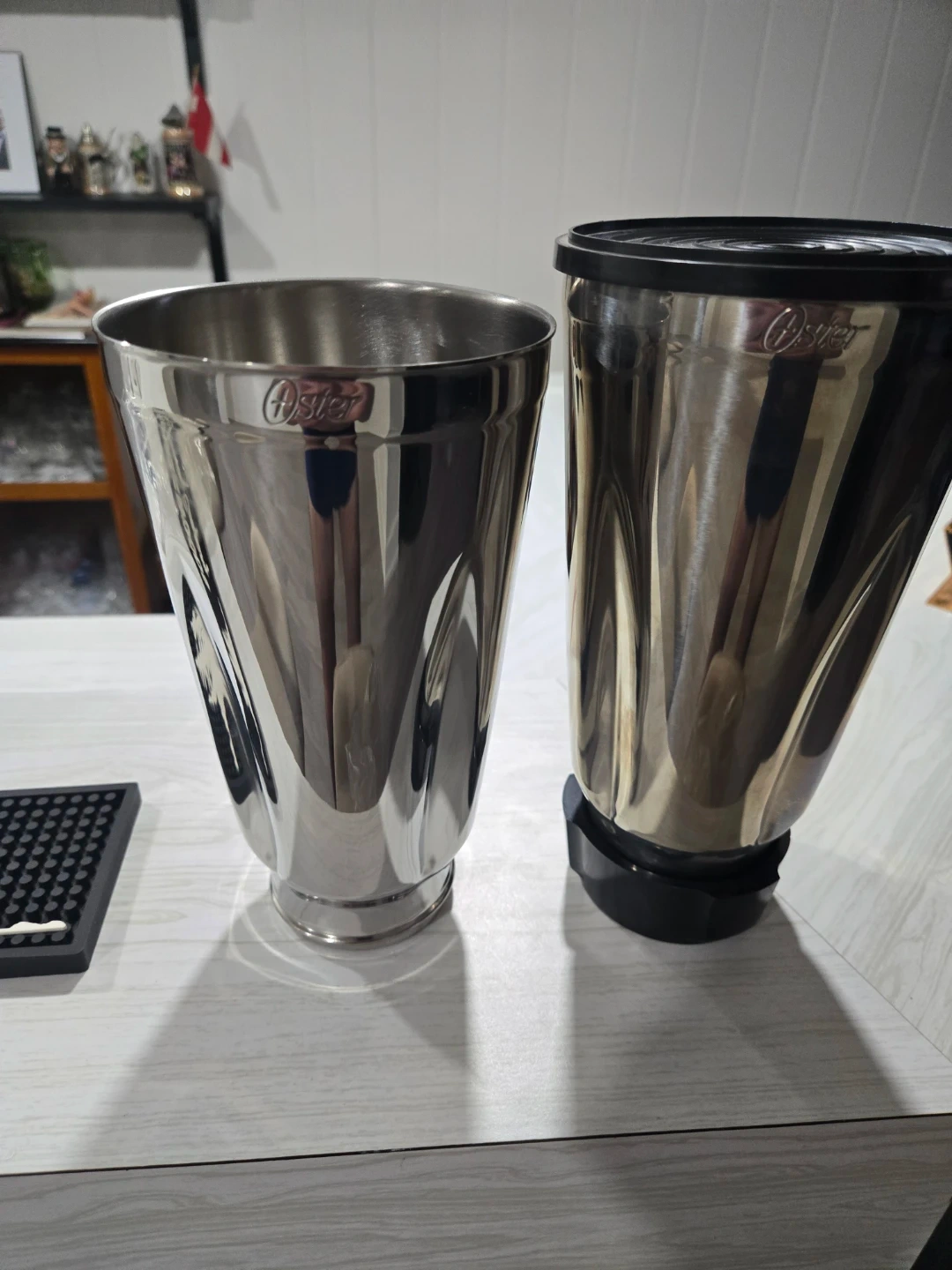Stainless steel blender jar by Oster. Comes with a black lid. It's designed for blending smoothies and other items. Great for making quick drinks! These are vintage and new. Had one lid and one screw on base for blender. Lid is loose has to be held if blending