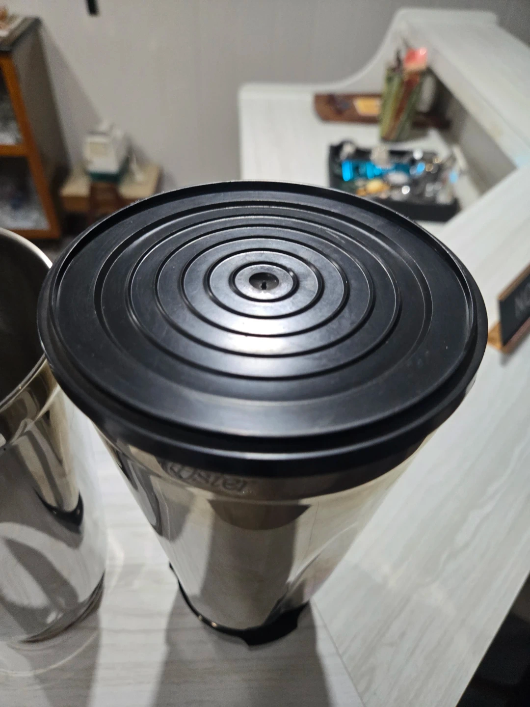Stainless steel blender jar by Oster. Comes with a black lid. It's designed for blending smoothies and other items. Great for making quick drinks! These are vintage and new. Had one lid and one screw on base for blender. Lid is loose has to be held if blending