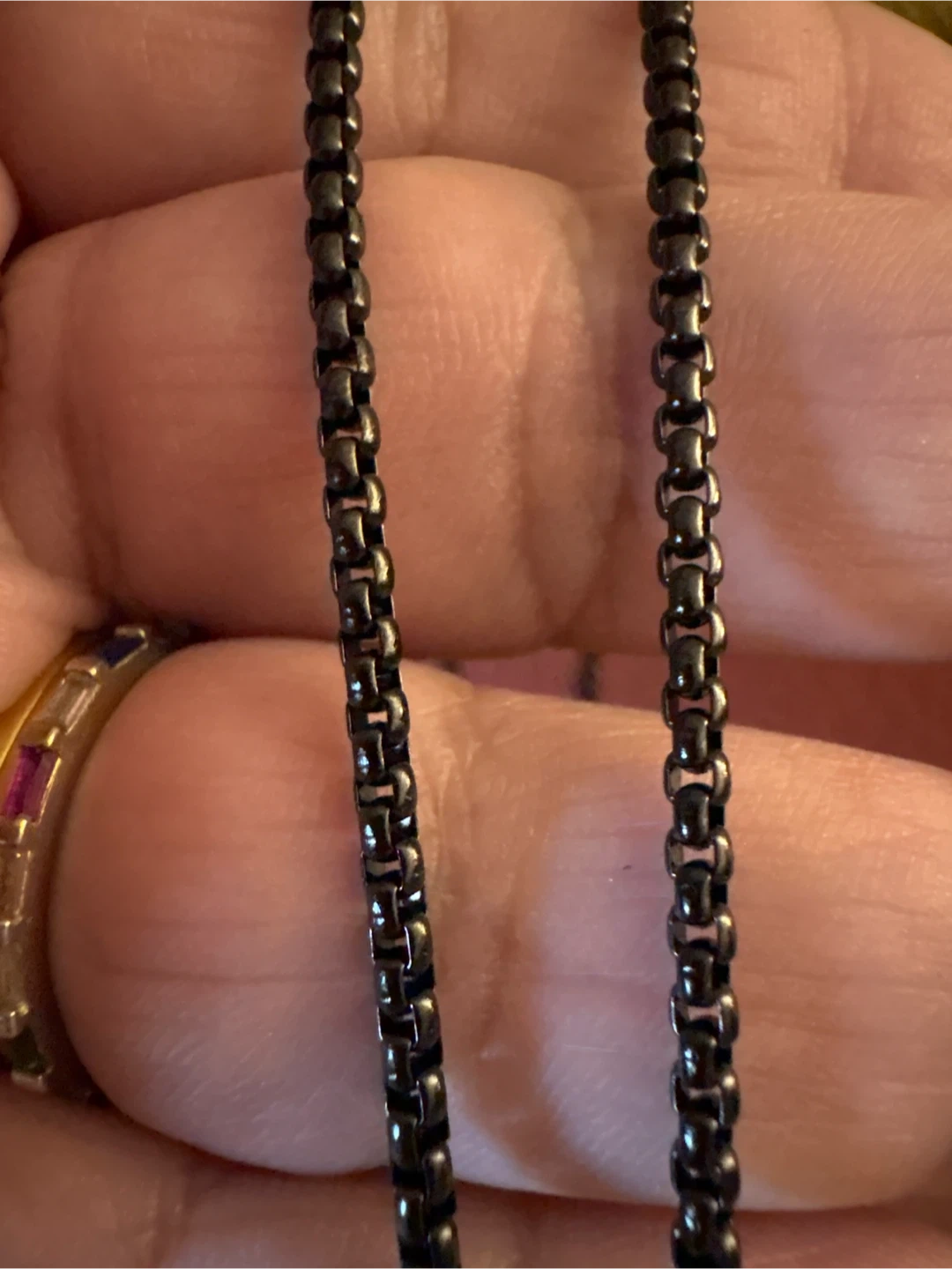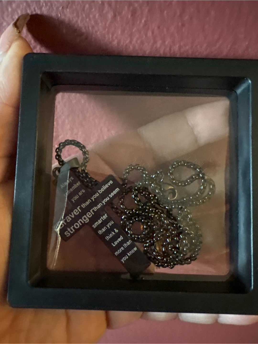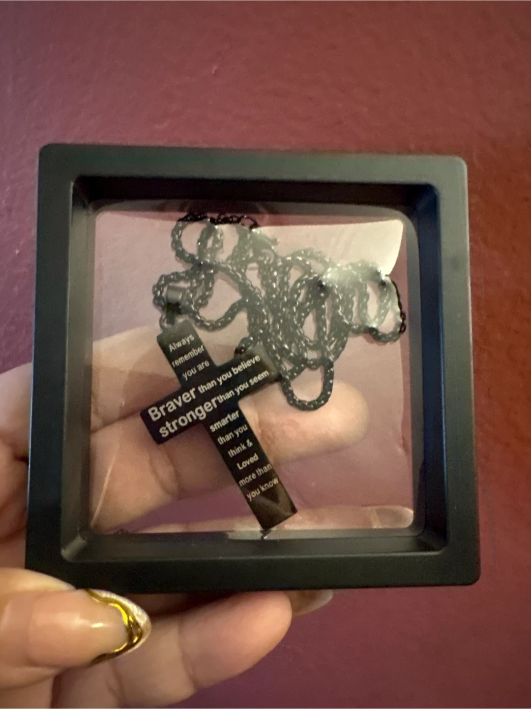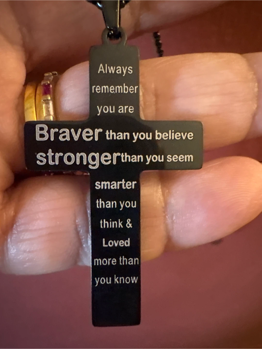 This black double sided cross pendant necklace features an inspirational engraving that reads 'Always remember you are braver than you believe, stronger than you seem, smarter than you think & loved more than you know.' The chain is approximately 20 inches long and made of durable titanium steel metal. It's a meaningful accessory for everyday wear. New with box