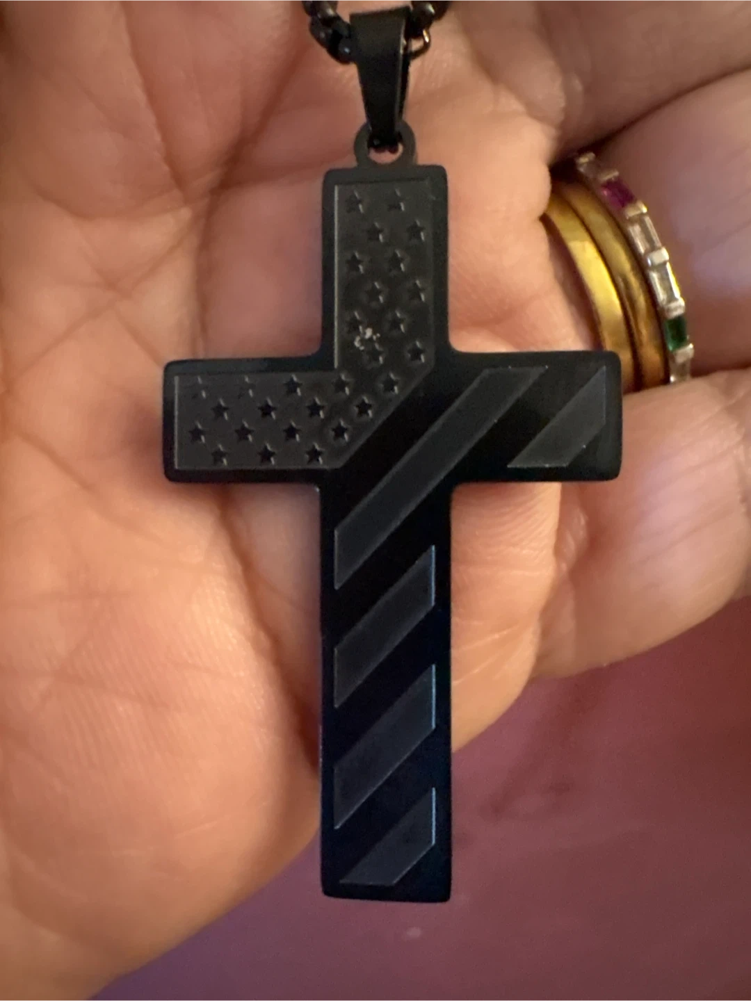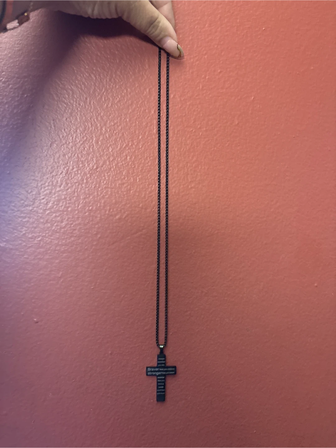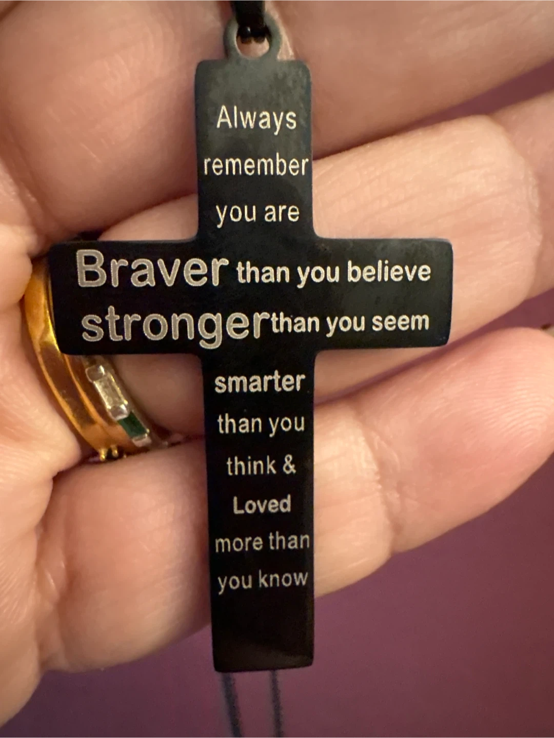 This black double sided cross pendant necklace features an inspirational engraving that reads 'Always remember you are braver than you believe, stronger than you seem, smarter than you think & loved more than you know.' The chain is approximately 20 inches long and made of durable titanium steel metal. It's a meaningful accessory for everyday wear. New with box