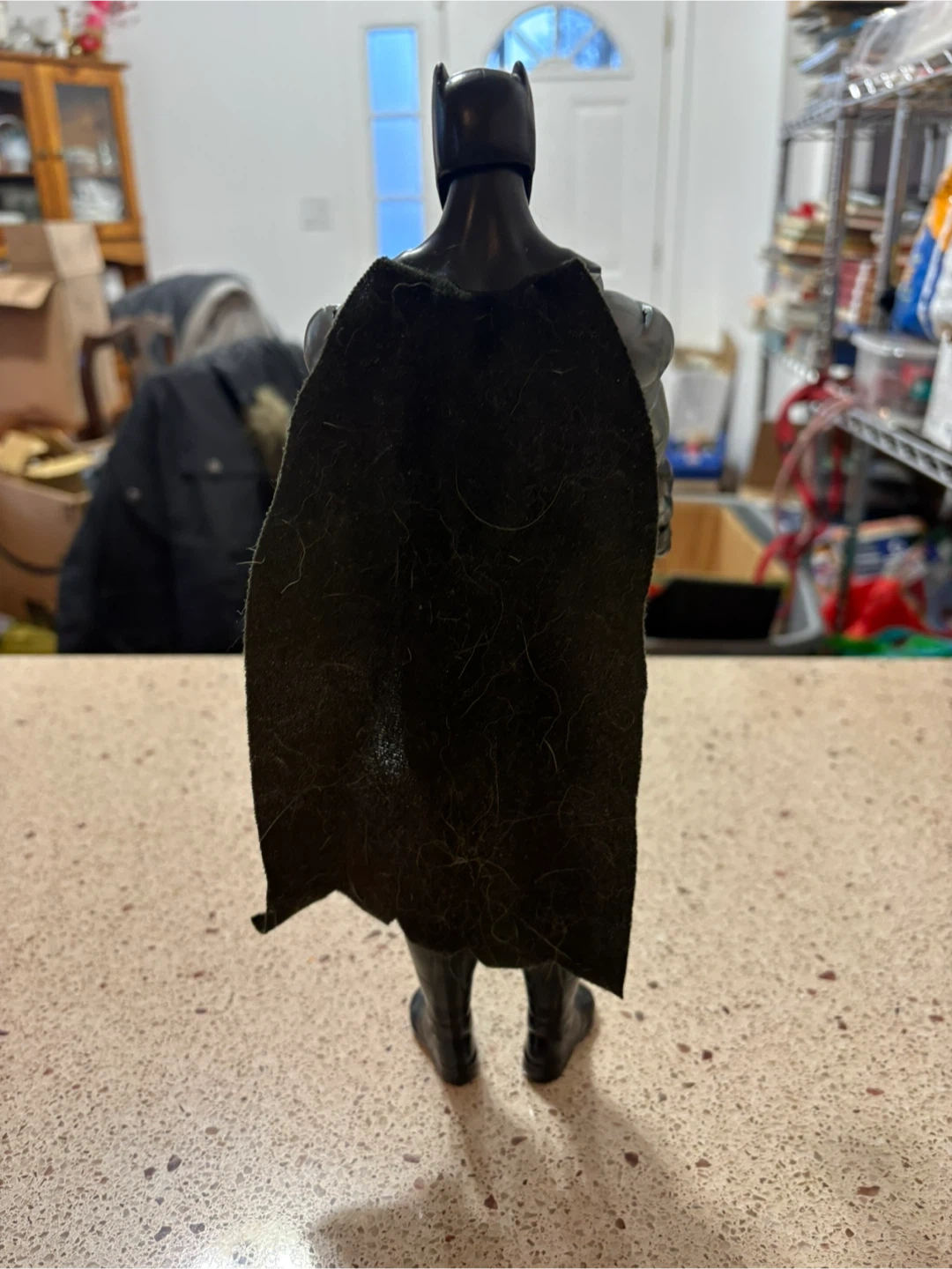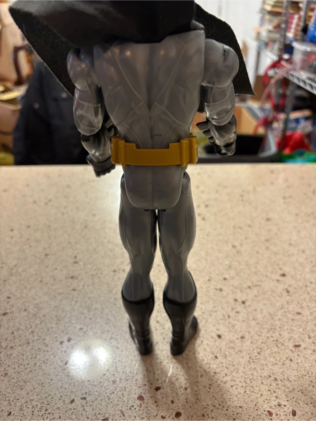This is a Batman action figure. It's grey and black with a yellow utility belt and a black cape. Made of plastic.