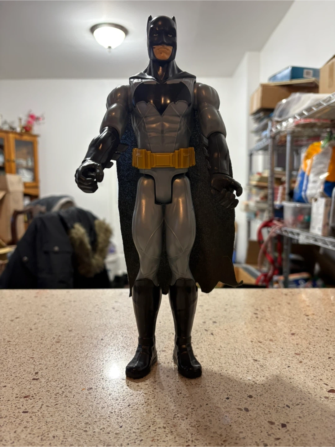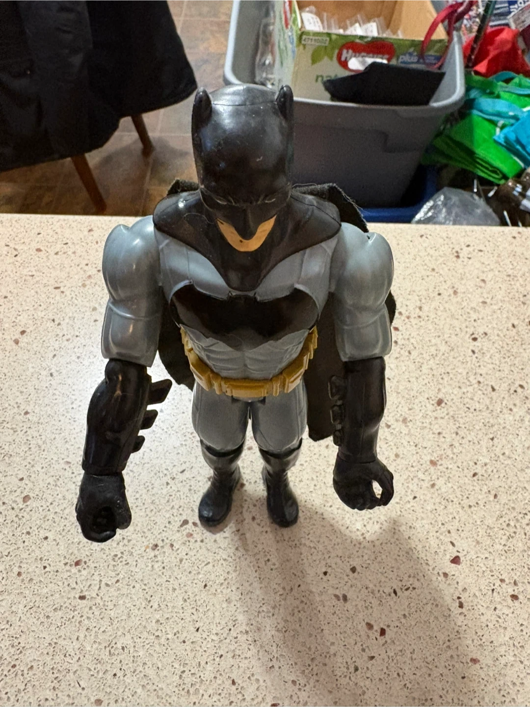 This is a Batman action figure. It's grey and black with a yellow utility belt and a black cape. Made of plastic.