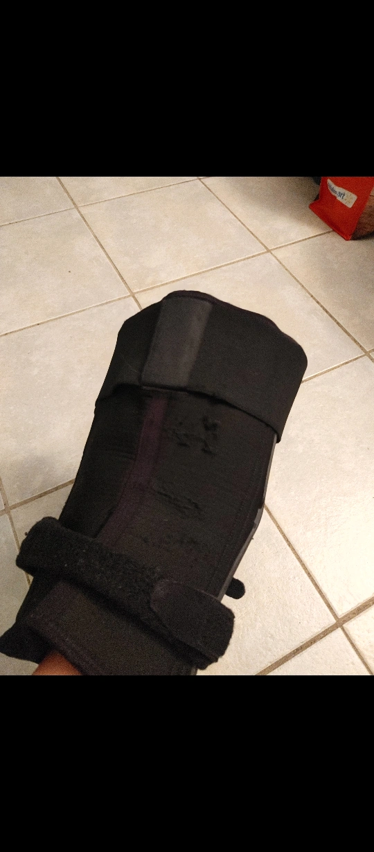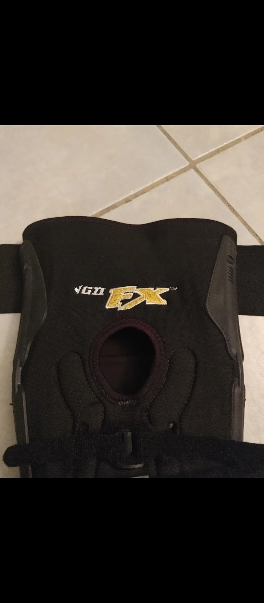 This is a black VGD FX knee brace. It's designed with adjustable straps for a secure fit. The brace has a padded patella opening for comfort.