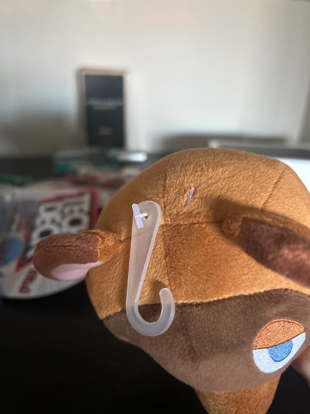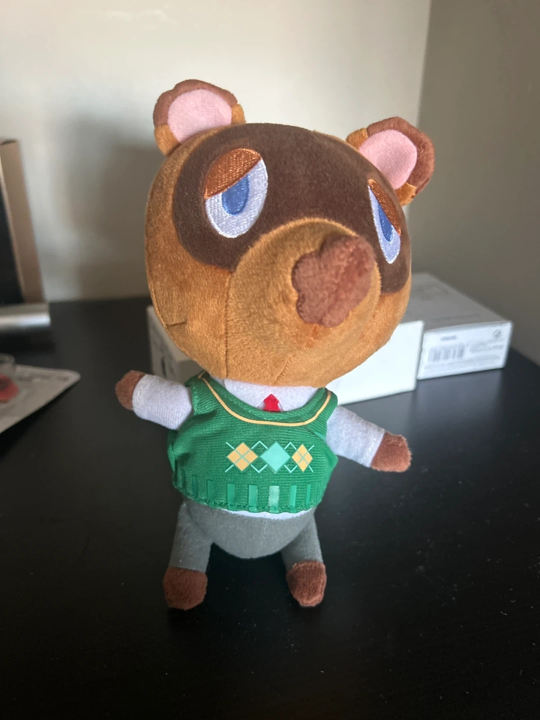 This is a plush toy of Tom Nook from Animal Crossing. It's wearing his signature green argyle vest. It's soft and huggable!