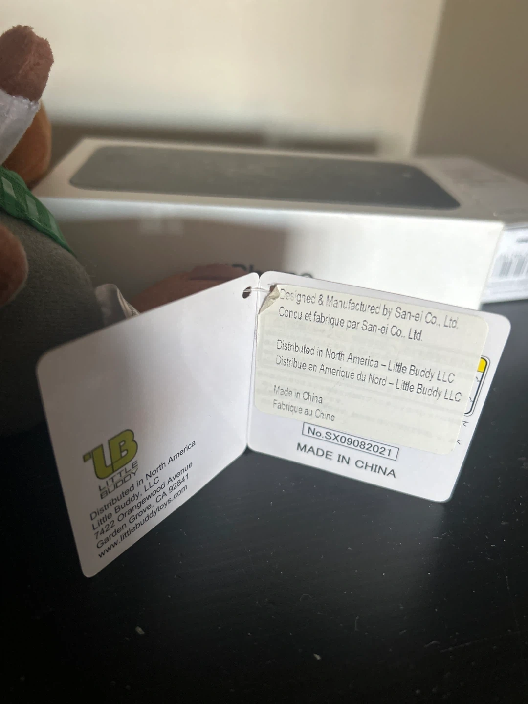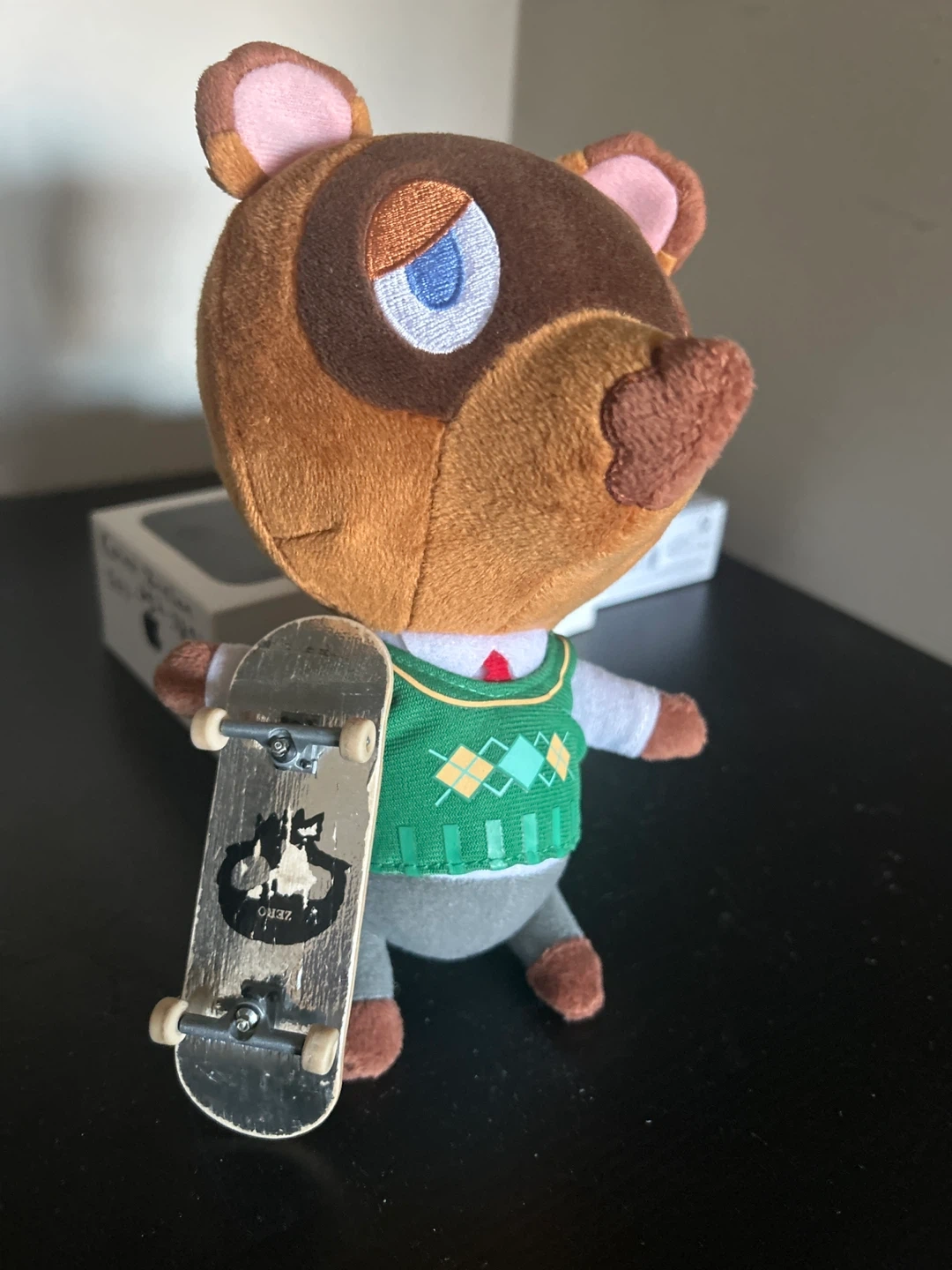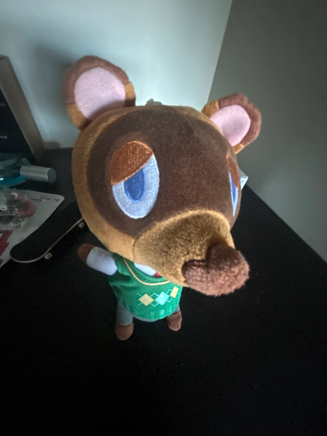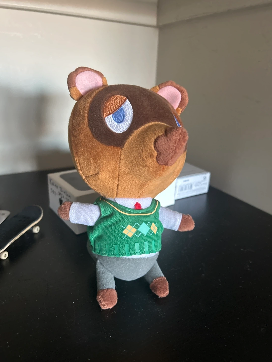 This is a plush toy of Tom Nook from Animal Crossing. It's wearing his signature green argyle vest. It's soft and huggable!
